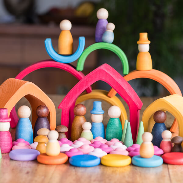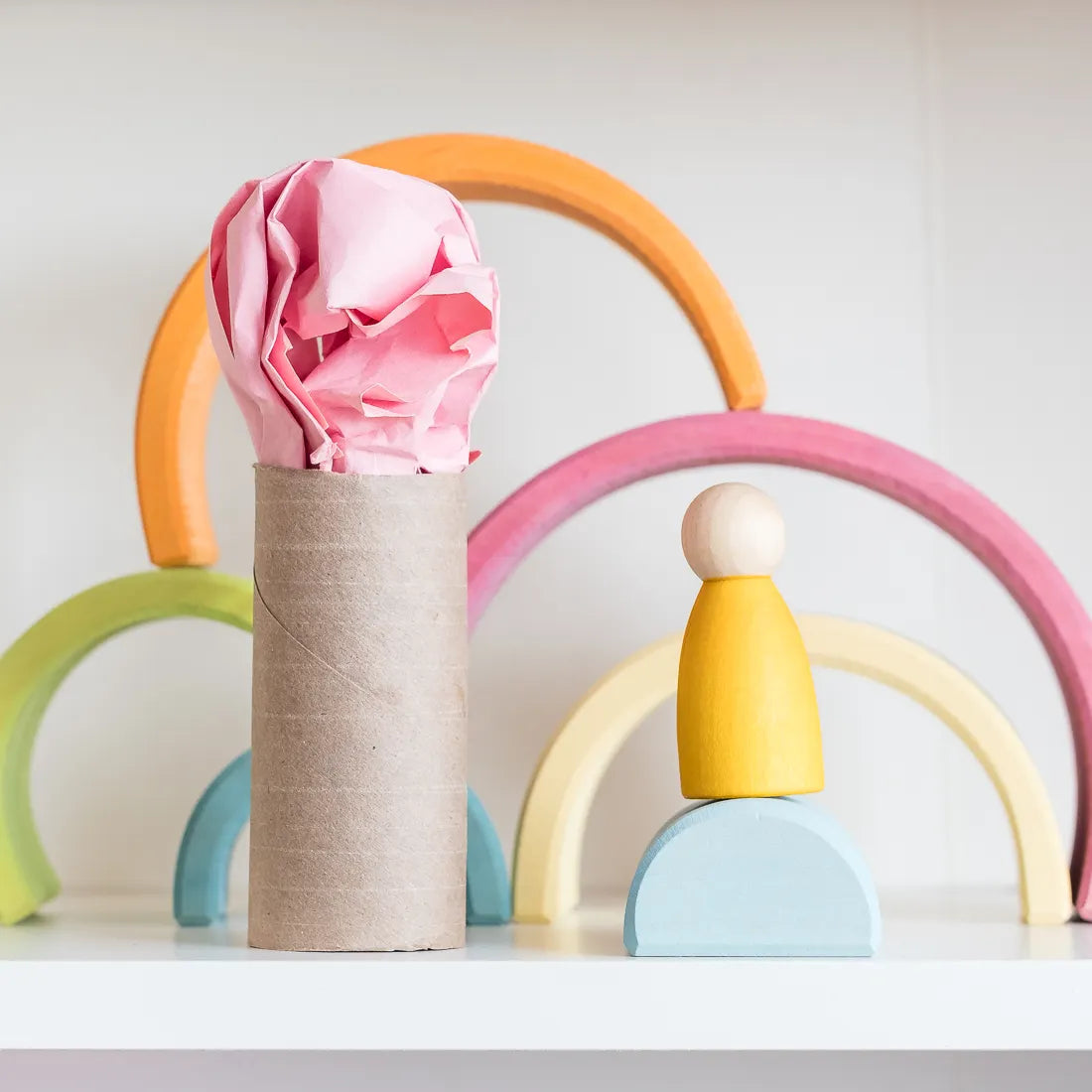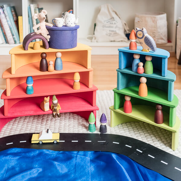 Wooden rainbows & stackers are ideal tools for small world play because the pieces can be used for several different things. Rainbow arches can be turned into animal enclosures, bridges, tunnels and slides for example. Adding some complimentary building tools like semi circles or building boards can add even more small world play options to the large rainbows.