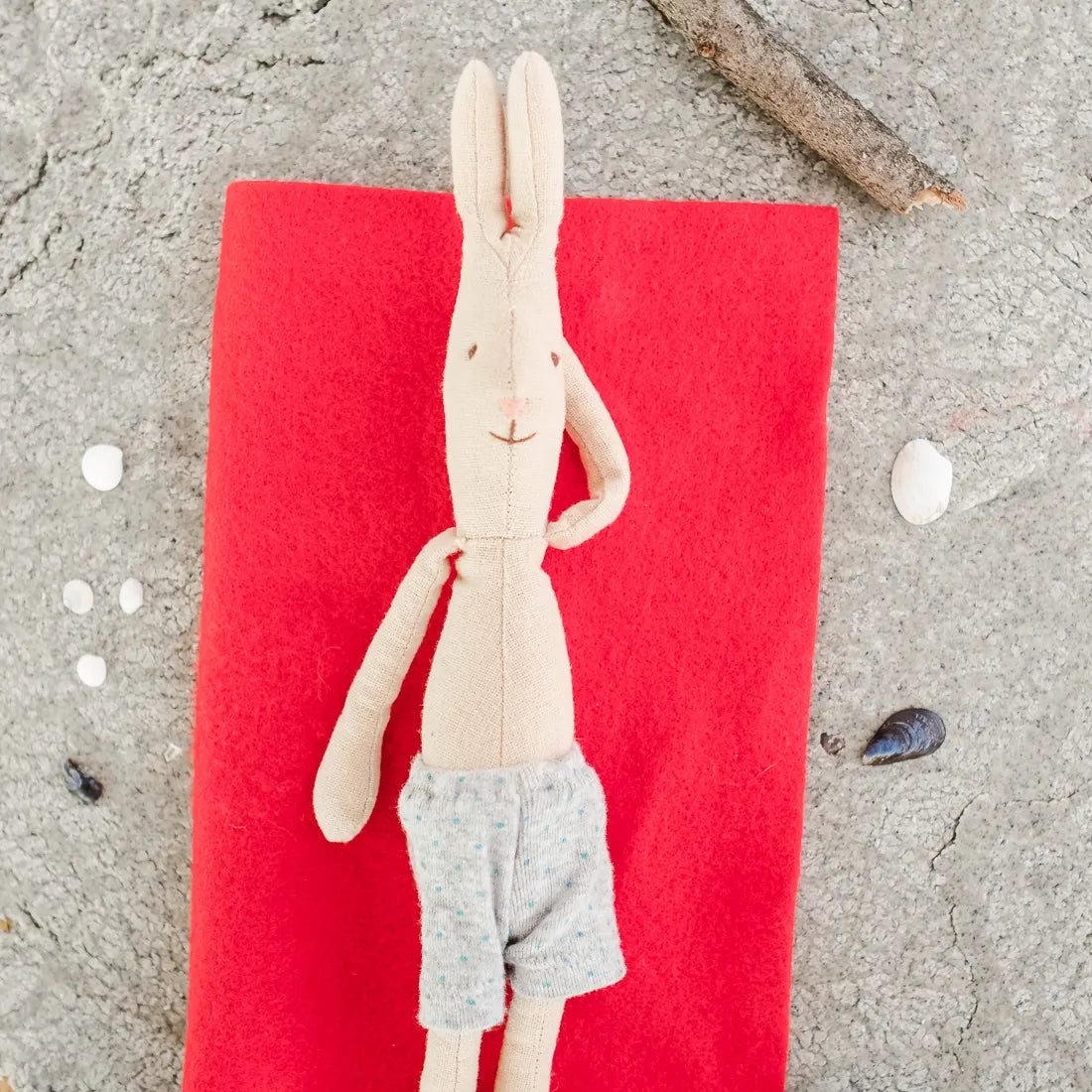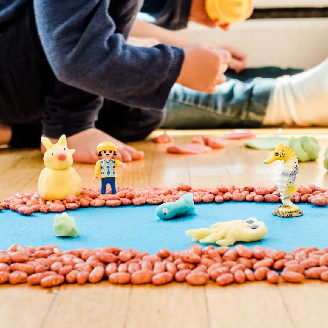 And if you have a craft corner, it’s easy to find materials to make little small world extras. Below we’ve used blue felt to be the ocean and some red felt to make a quick beach towel. Wondering about the sand? We just made a sand play dough at home.