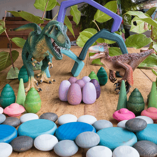 These gorgeous toys are made in Spain and have rich, captivating colours. Durable, imaginative and full of beauty, these are some of our favourite toys. Trees and green cones make an instant forest scene, honeycombs and mushrooms are delicious food for small figures, purple or rainbow eggs can be used either as food or as the eggs of animals and dinosaurs, flowers make for a beautiful meadow and so on. And their wooden coins can be used to make paths for figures to follow or geographical features like rivers.