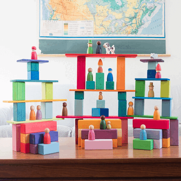 Blocks are the ultimate toy in our books, because they’re useful for so many kinds of play (read more about this HERE). For small world play, we love using blocks to stand for tall buildings in a city scene or animal enclosures for farm animals. But they can make anything from a swimming pool to a parkade to a fantastical castle. Here are some of our favourites: