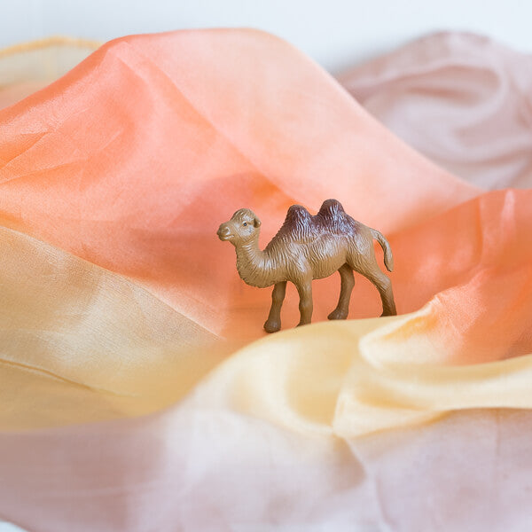 Use an ocean (or any blue) silk to be a river, a pond, a swimming pool, or the ocean. Use the desert silk to be a desert or a sandy beach. Use the forest silk to be forest ground cover or grasslands for farm animals to graze on. Silks also make perfect canopies for block structures making a dreamy home for some lucky play figures.