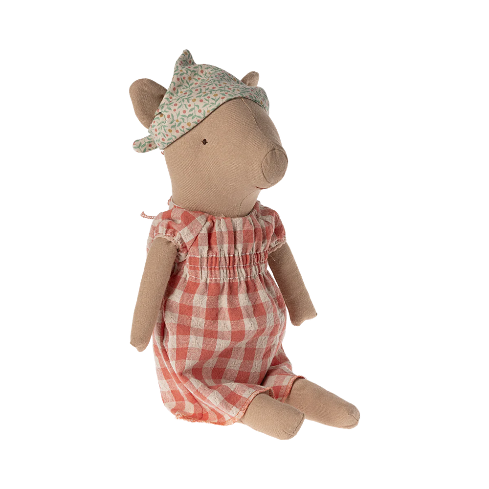 Oink Oink - say hello to the sweetest pig. This pig come in a beautiful dress and scarf and can sit on its own. Create your own pig family by adding more family member from the collection.
