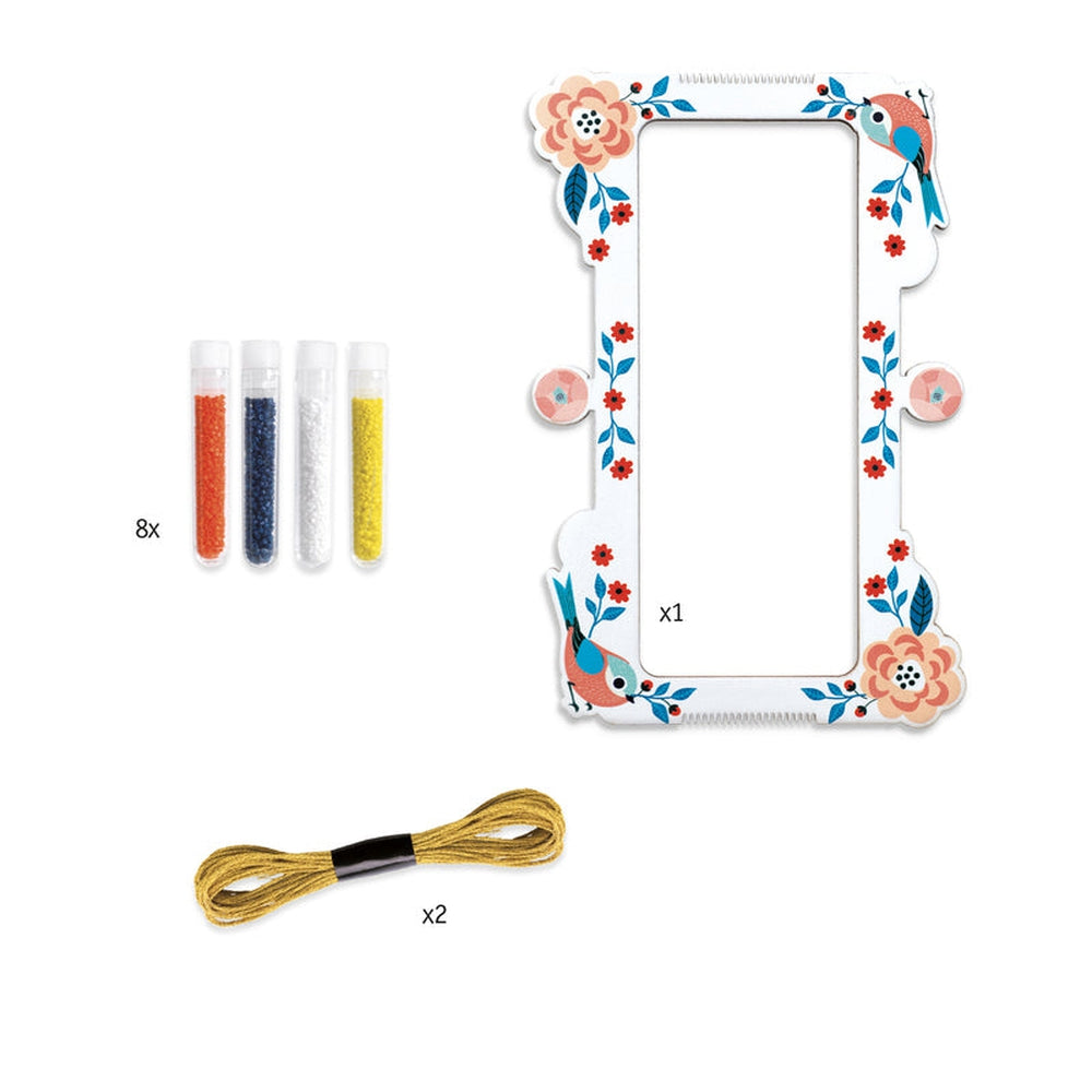 - includes beading loom, gold thread, an assortment of beads, needle, and instructions