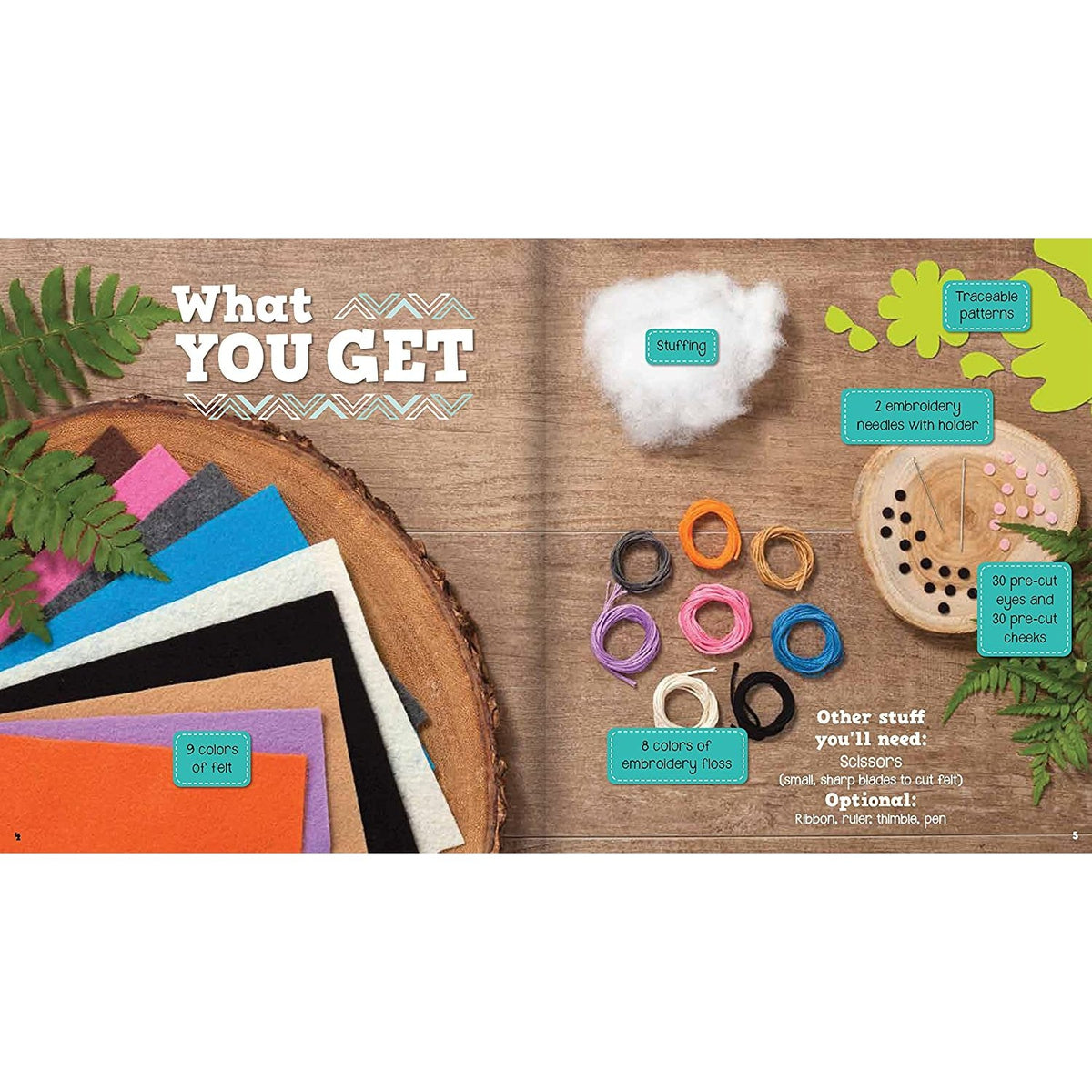 - includes 12 sheets of felt, 8 colours of embroidery floss, 15 sets of pre-cut felt eyes and cheeks, 2 embroidery needles, polyester fibre fill,
