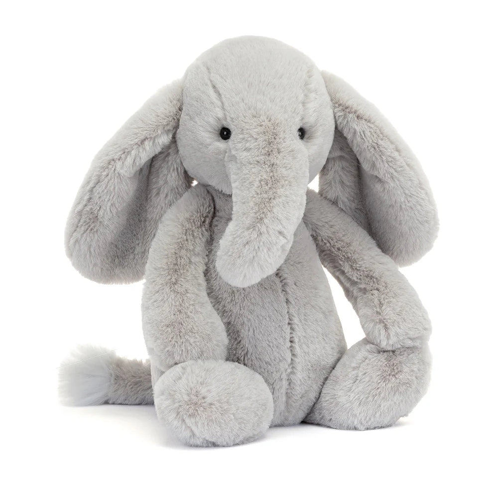 Bashful Luxe Elephant Thuddeus has a nose for adventure. In luxuriously soft grey fur with a fluffy tail tip, Thuddeus uses that long, curved trunk to sniff out new friends, and those big ears to listen to exciting stories. What adventures will you seek out together?