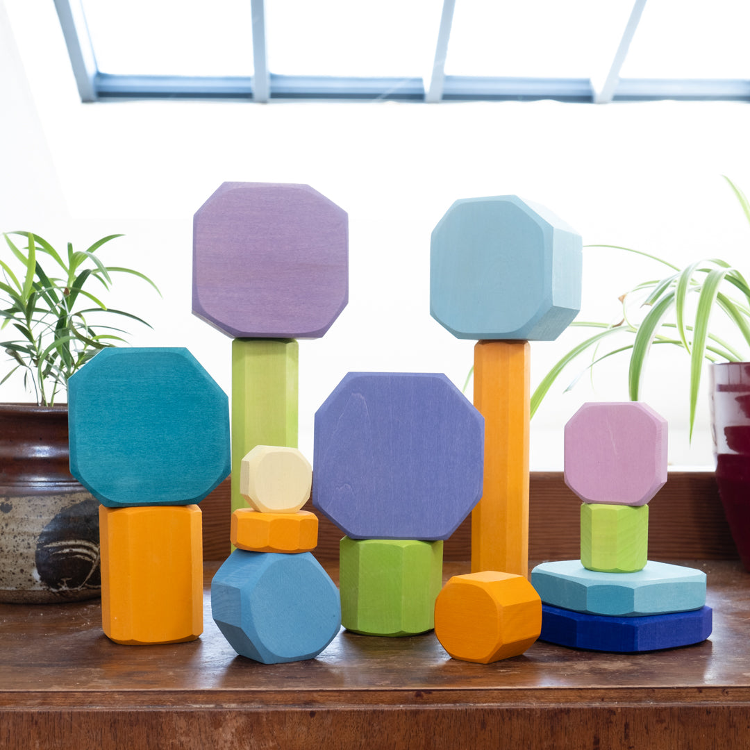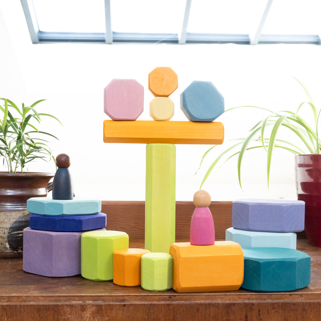 The perfect imaginative block set from Grimm's for building trees, hedges, and landscapes. Let the unique shapes and natural colours inspire your little builders to create forests and backdrops for all their woodland animals. Younger kiddos can practice stacking and balancing these rounded edge blocks.