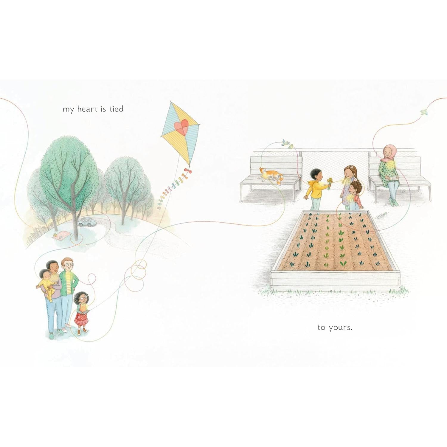 There's a heart string binding us all together! Through backyards and neighborhoods, over mountains, and across oceans, this colorful heart string ties us all together. Out of sight yet undeniable, it joins our hearts so that we are never truly alone. Follow the thread of this reassuring story to see how, even in a world as vast as ours, there is always a bond that connects us to the ones we love—and to the world we share.