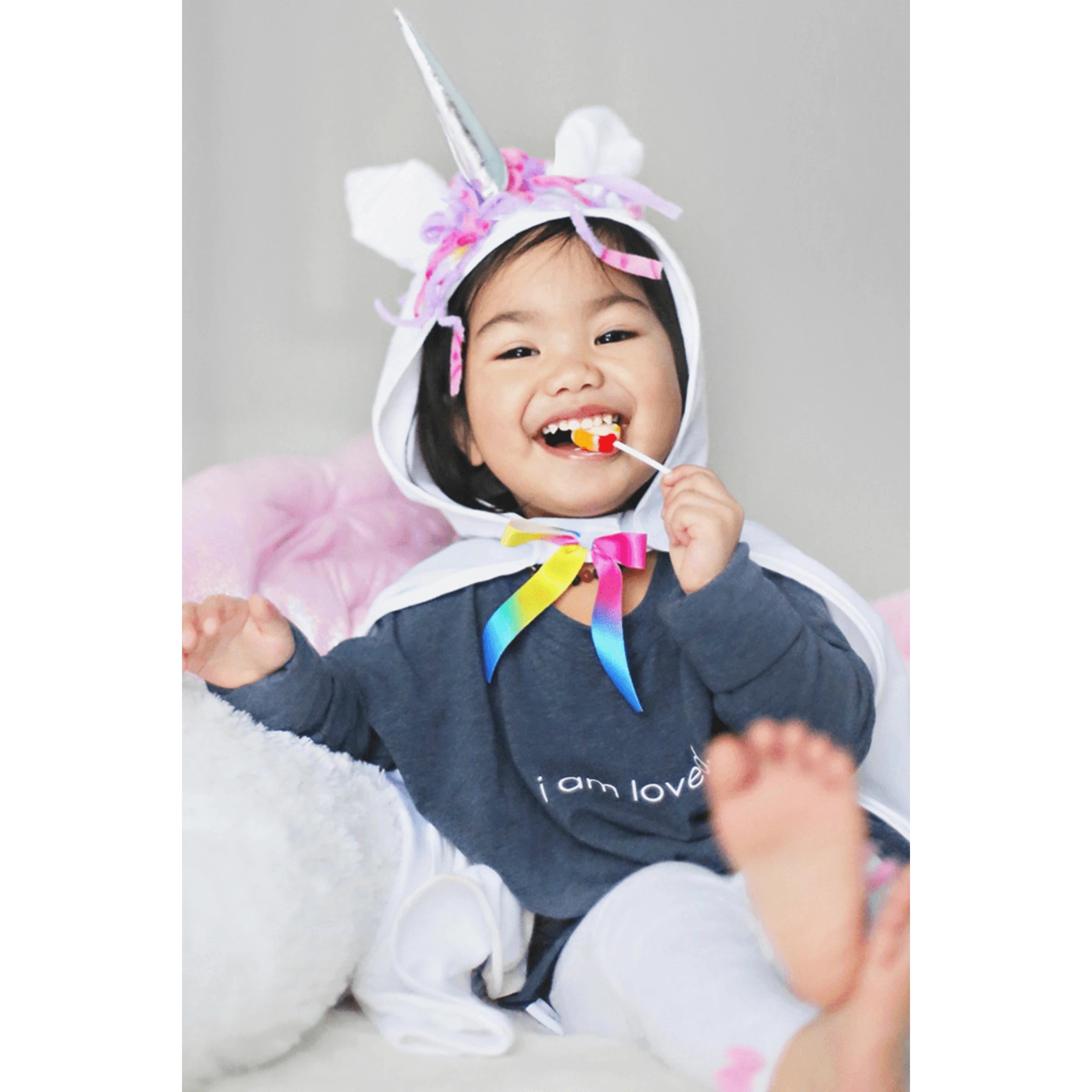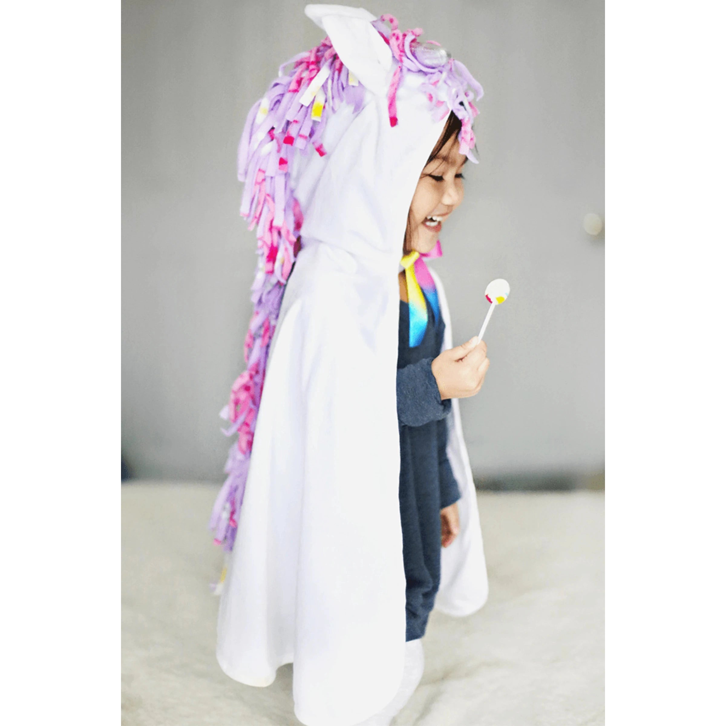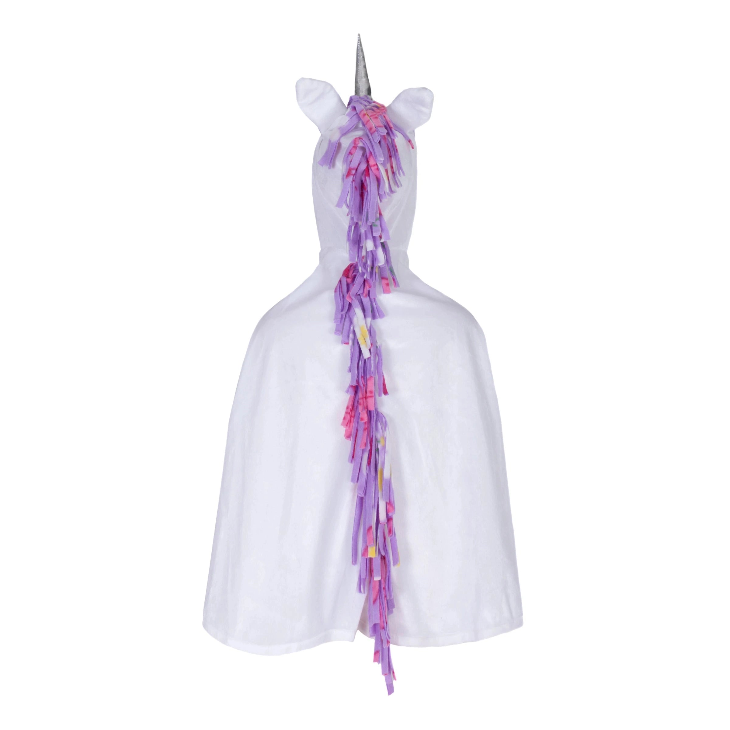 Perfect for those who want to dress up as their favourite fairy tale creature, this cape features a bright multi-coloured mane with a silver horn. A Velcro closure at the neck ensures for easy on and off dress-up. The white fluffy fabric is soft to the touch and is easily machine washable in case your little toddler takes their unicorn magic outside.