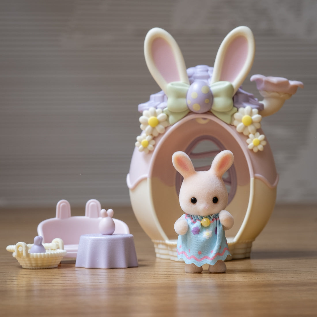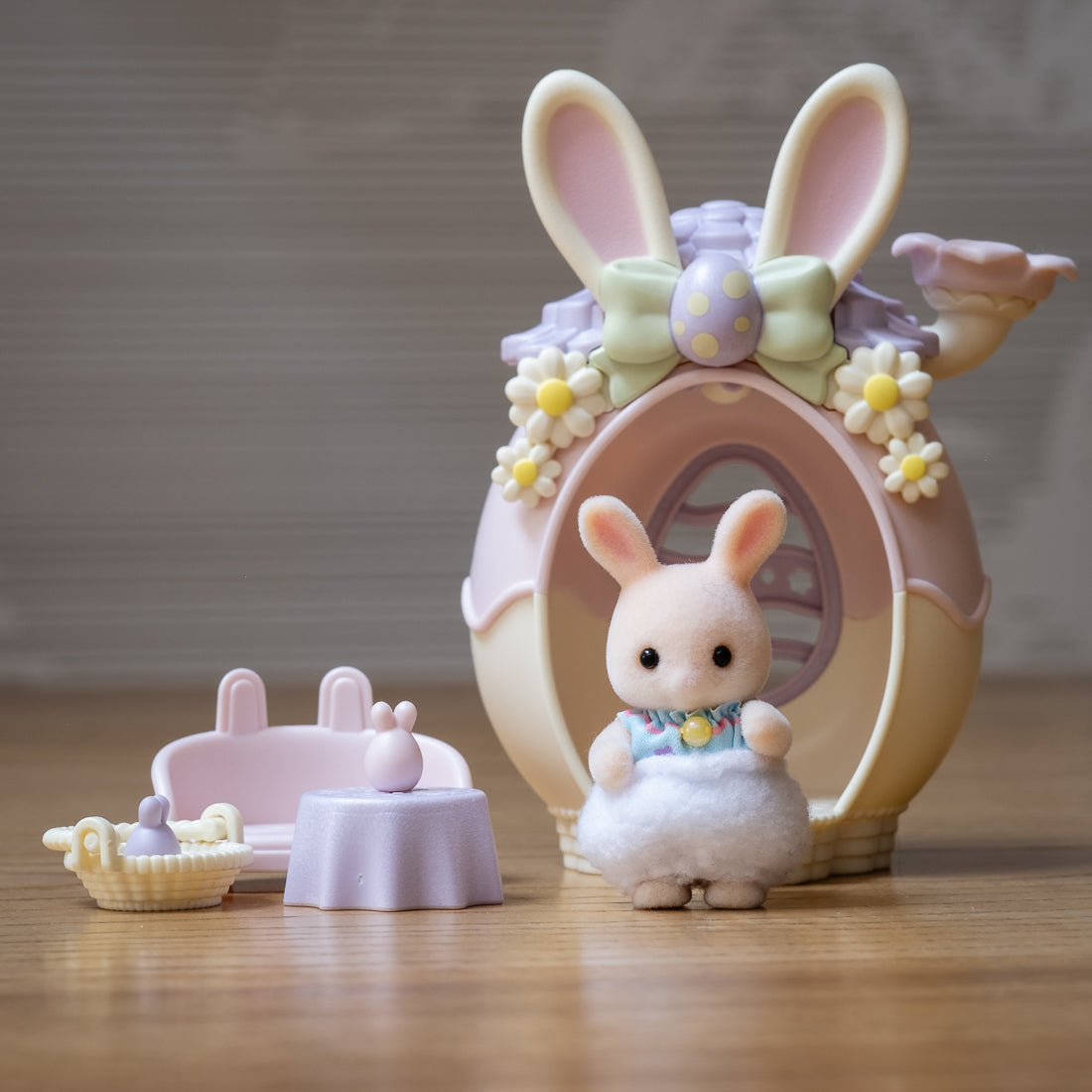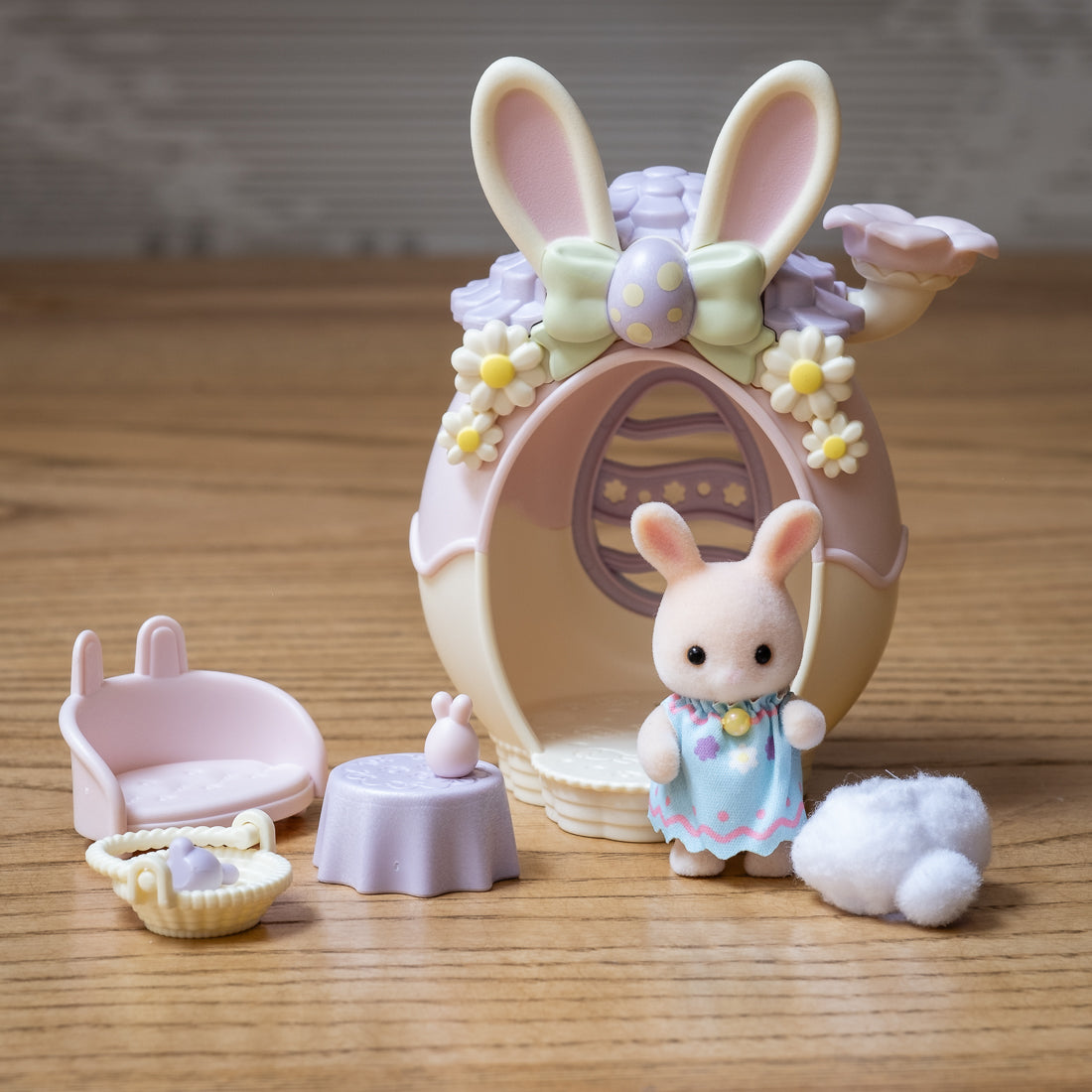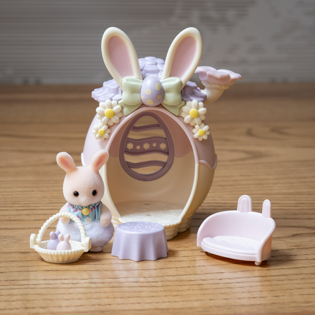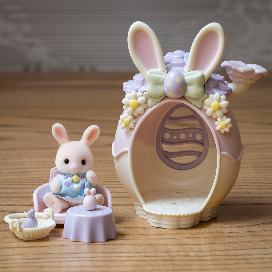 A seasonal product. This set includes the Marguerite Rabbit baby, accessories and a little house with a bunny and Easter egg motif. Hide the rabbit-shaped Easter eggs in places like the chimney and under the tablecloth for an Easter egg hunt. There are egg motifs hidden all over the house and furniture—see how many you can spot! The Marguerite Rabbit baby is wearing a cute Easter-themed outfit.