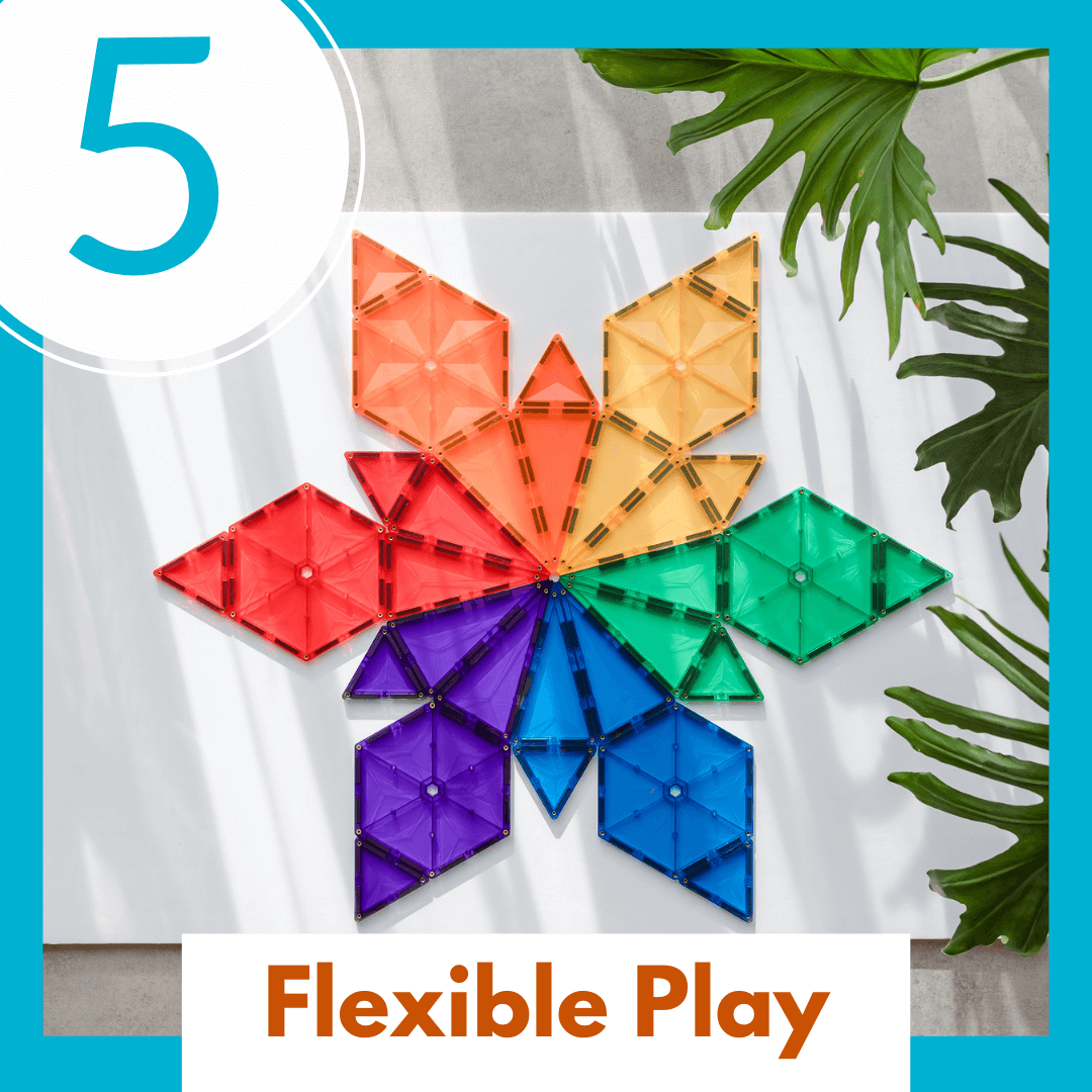 Connetix can be played with in 2D or 3D. These tiles can be arranged on the floor or a magnetic surface like a fridge into all kinds of 2D designs (like a square) or into 3D structures (like a cube). Both kinds of building challenge the brain by building creative thinking and problem