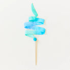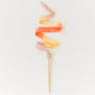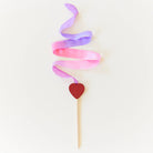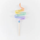 A birch wood wand with a shimmering rainbow silk streamer, topped with a decorative wooden bead.