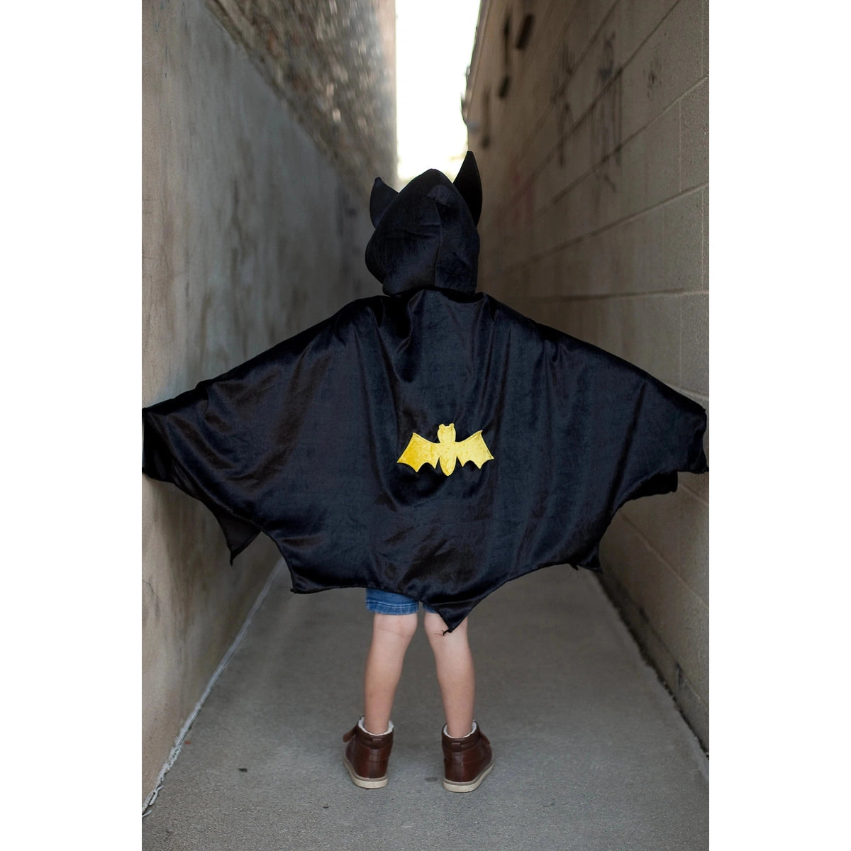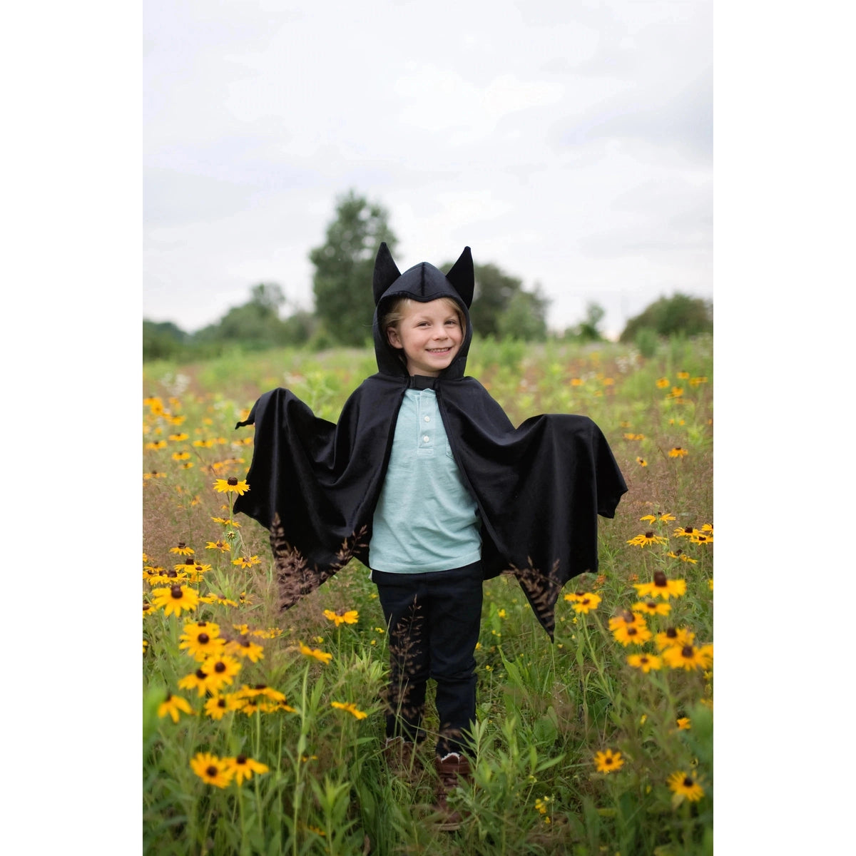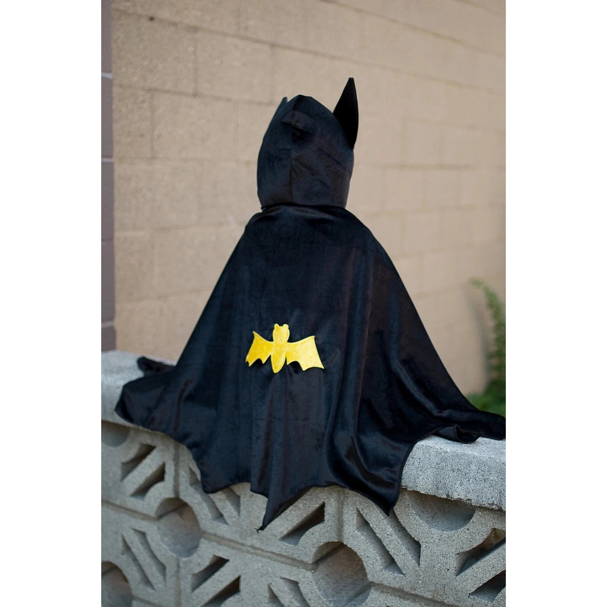 Ready superhero fans! This hooded bat cape features large bat ears on the hood and an awesome bat emblem on the back of the cape. The cape is made from soft velour fabric and is cut like real bat wings with a scalped edge. This made in Canada cape will have you set for many superhero adventures.