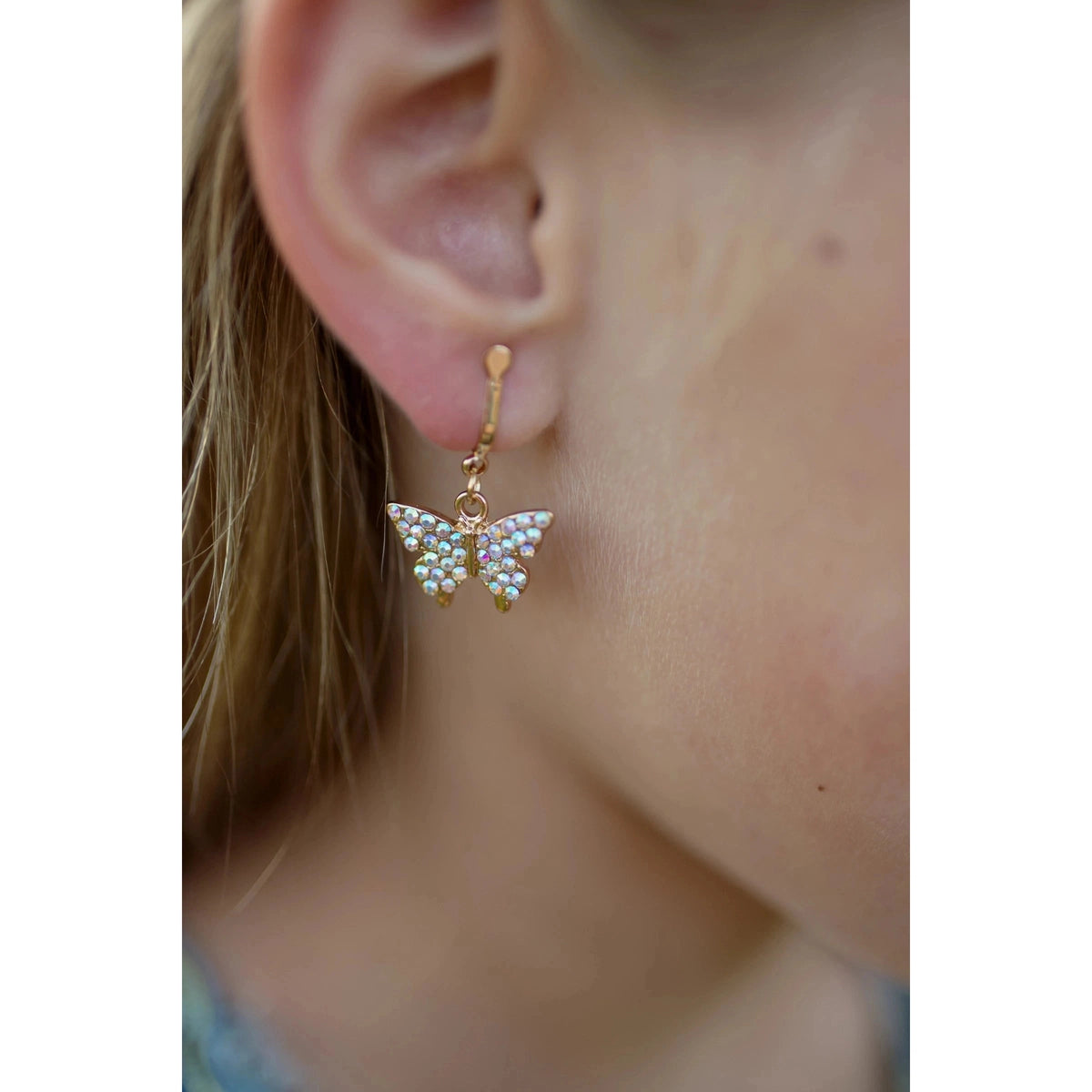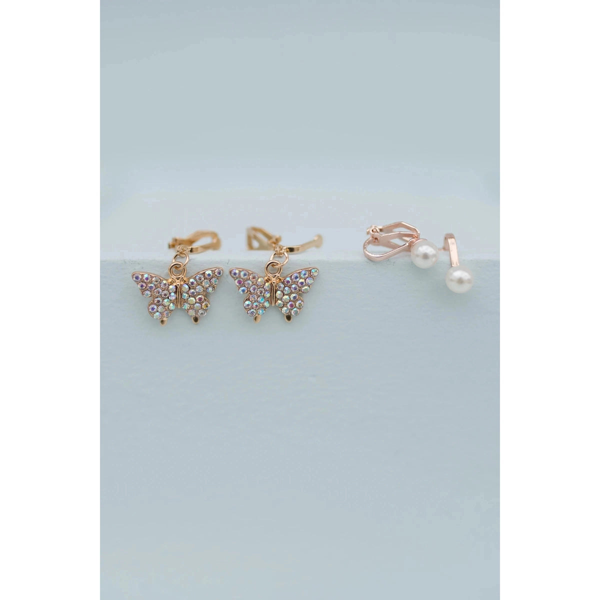 These drop-style clip-on earrings are made for children with unpierced ears. This set comes with a rhinestone-encrusted butterfly style and an elegant pearl style, made with rose gold-colored metals.
