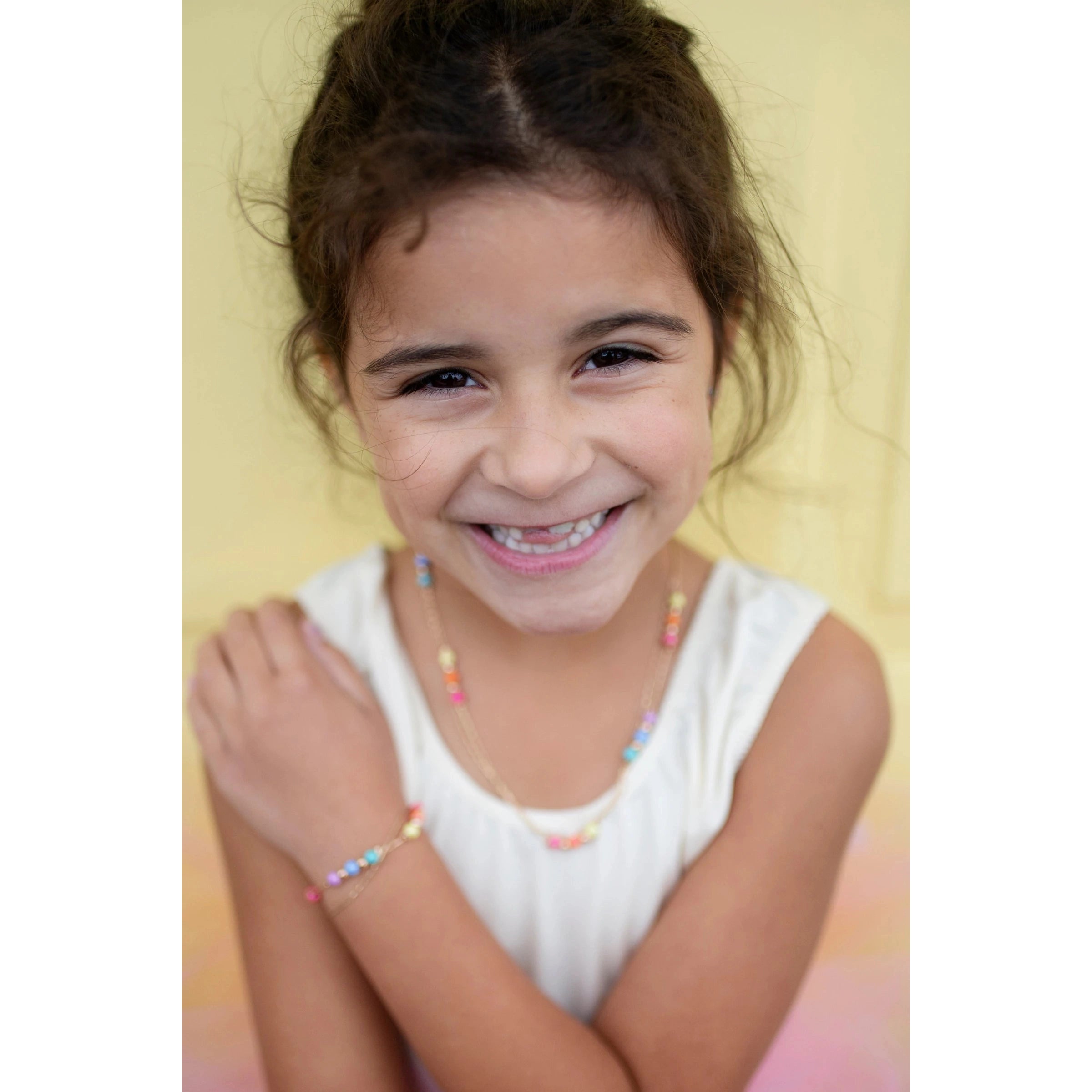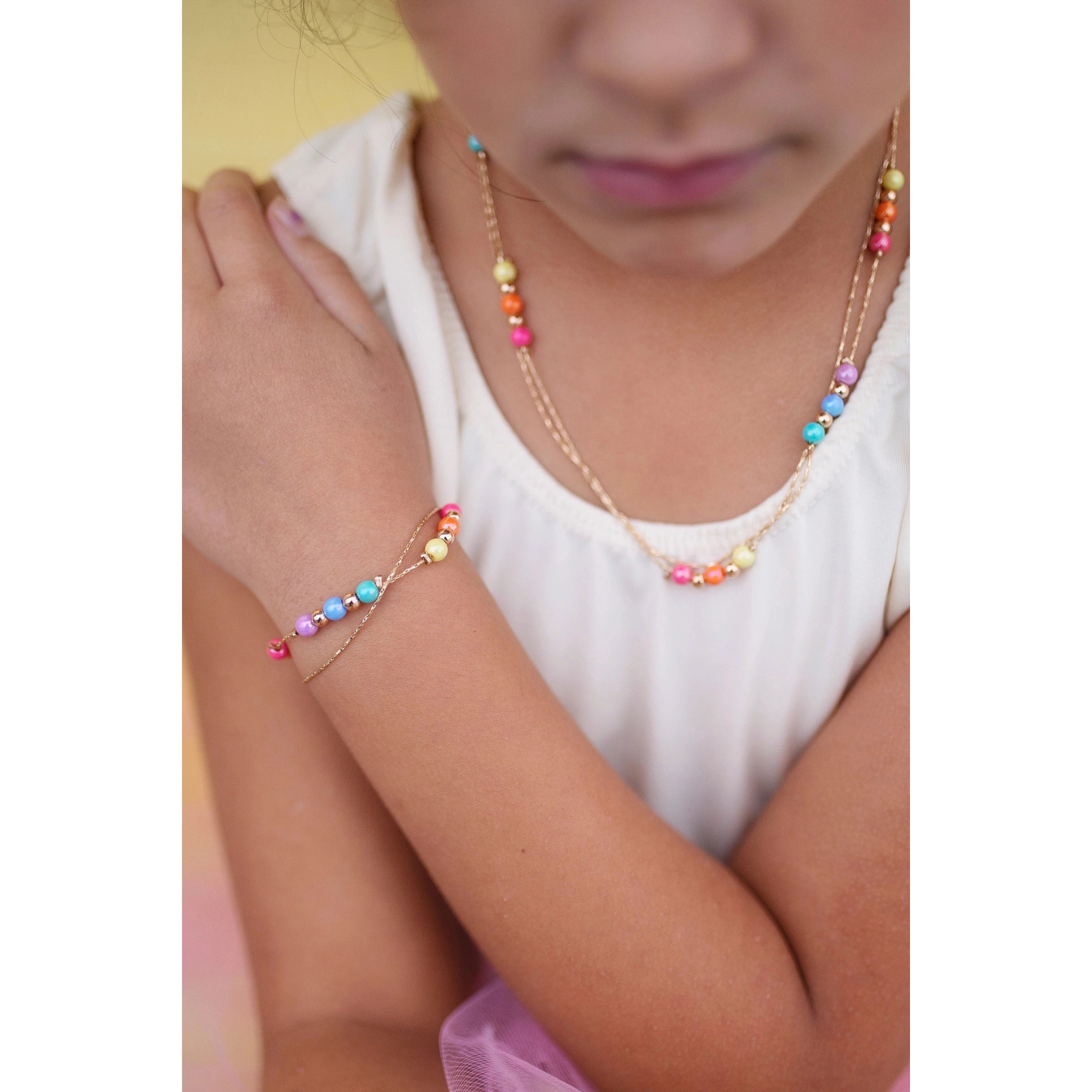 A unique pairing of dainty gold chains with pearly rainbow & metallic beads makes our Boutique Golden Rainbow bracelet as elegant as it is fun. Pair it with the Boutique Golden Rainbow necklace to complete the look.