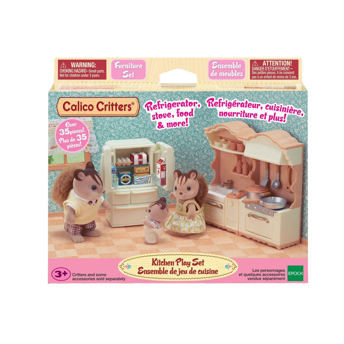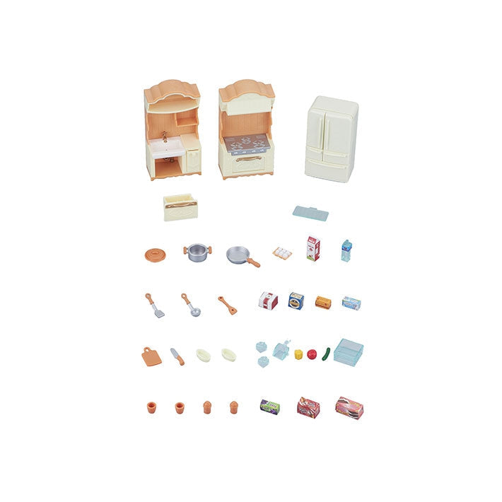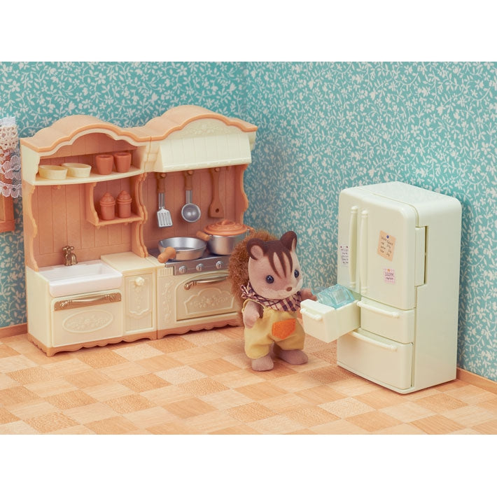 The Kitchen Play Set from Calico Critters adds a whole new level of fun to imaginary play. Complete with everything you would need for whipping up a feast for guests or grabbing a midnight snack. Set includes a two-door refrigerator with 3 drawers, a stove unit, a sink unit, plus tons of utensils, ingredients, and other accessories. Bake a cake, grab ice from the freezer, or chop some veggies for dinner — this set has everything you need. Pair with your favourite Calico Critters figures for endless fun.