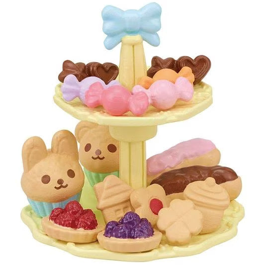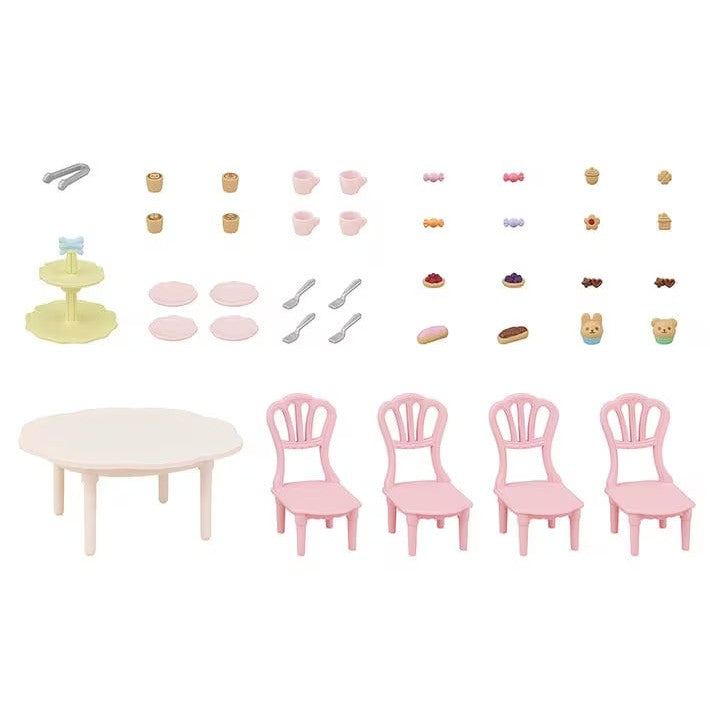- Furniture set featuring colourful table and chairs, with coffee, cakes, and other sweet treats