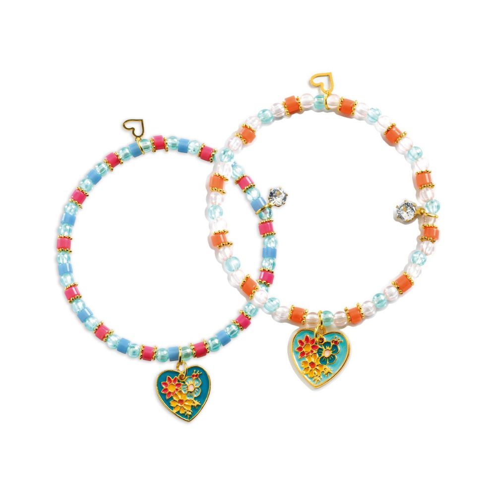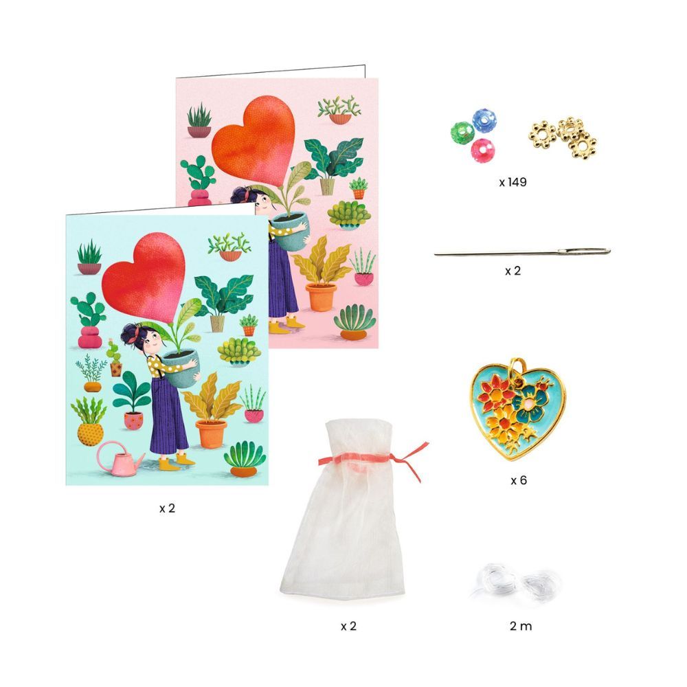 - includes beads, stretchy thread, charms, two needles, full instructions, two organza bags, and two illustrated cards