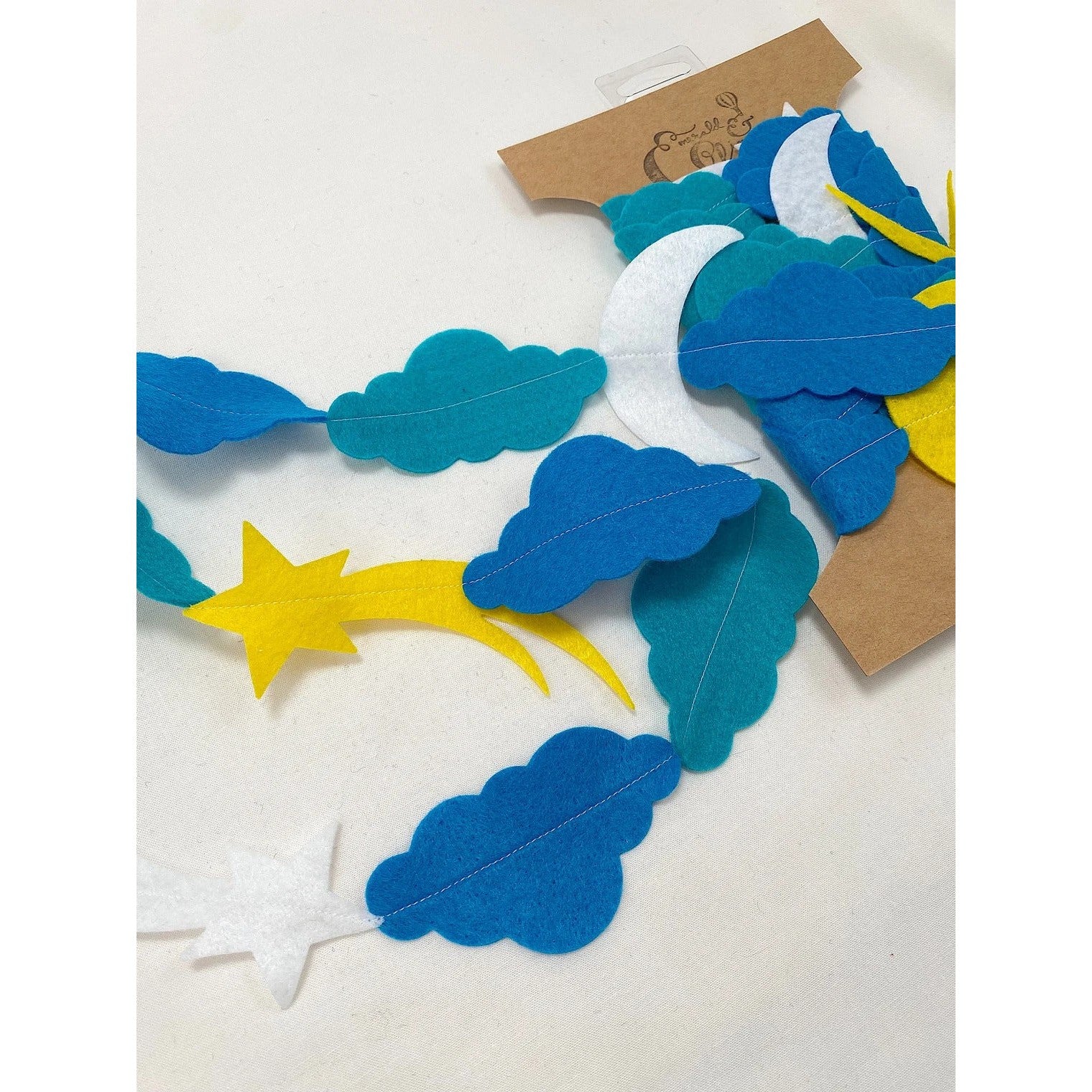 Drift off to dream land with one of these handmade, night sky inspired, sleep time garlands floating above your bed. Comprised of stars, crescent moons, and fluffy clouds, these garlands are perfect for children or adults alike.