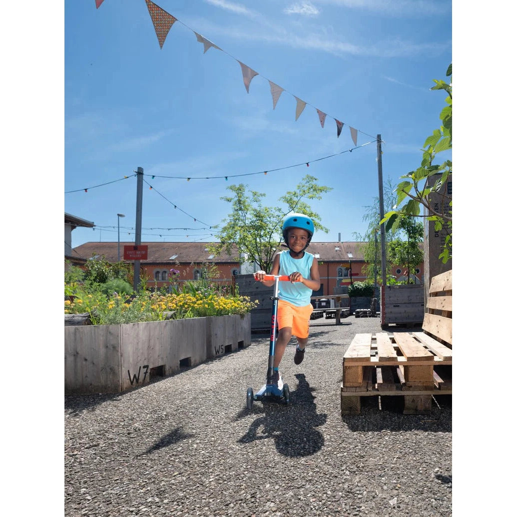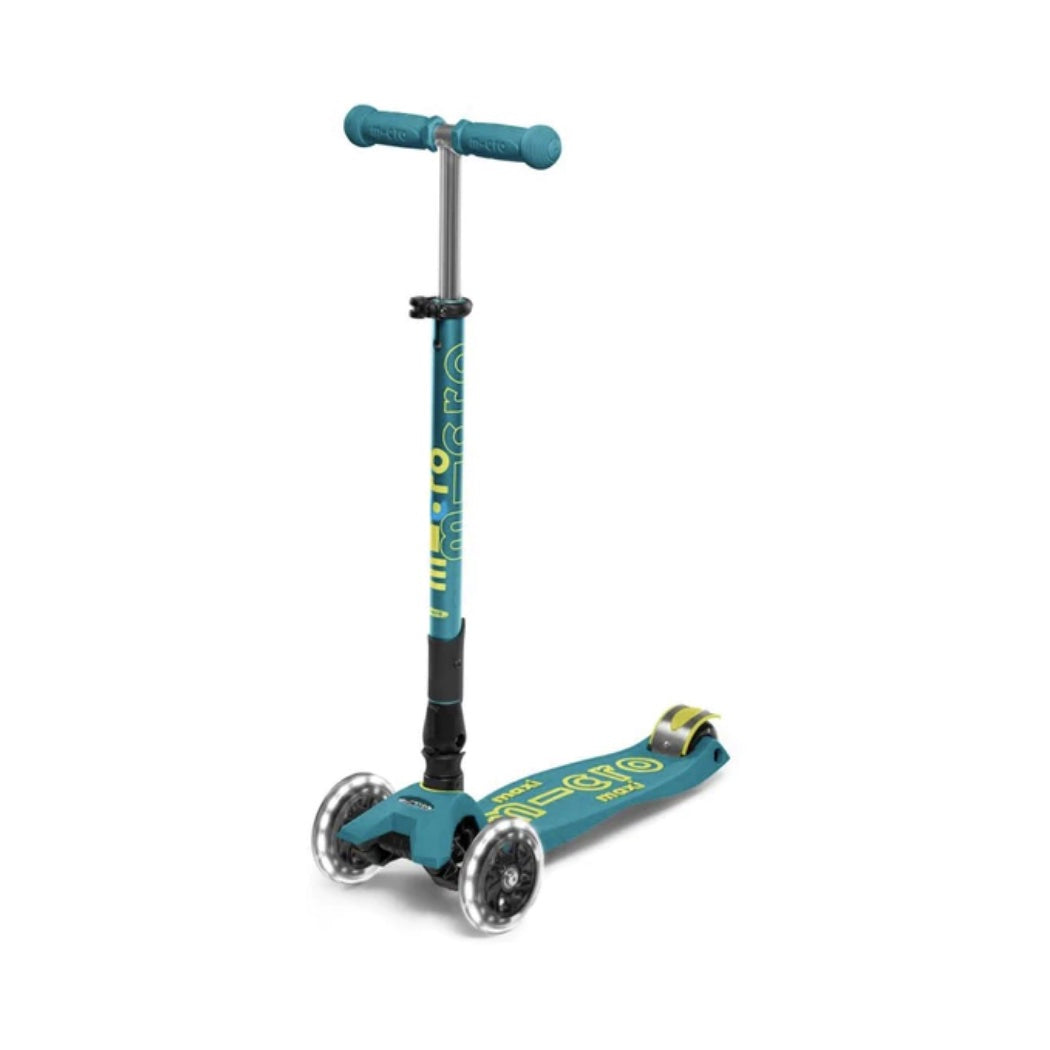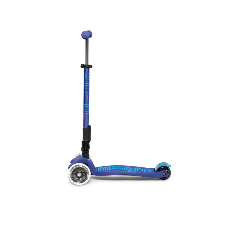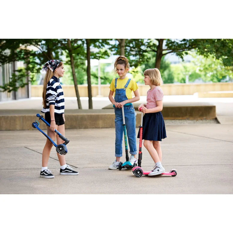 The top scooter choice for elementary school-age kids. Designed for stability and smooth-gliding mobility, the Maxi foldable LED Deluxe is a little like being on a skateboard, but with greater control and maneuverability. Features 3 wheels, gentle axle steering, and a low-to-the-ground deck. Durable and lightweight, kids will intuitively learn to steer by leaning and shifting their body weight to turn left or right, and build their confidence in the process. The three wheels are not "training wheels" but allow for a more dynamic, sporty, and playful ride!