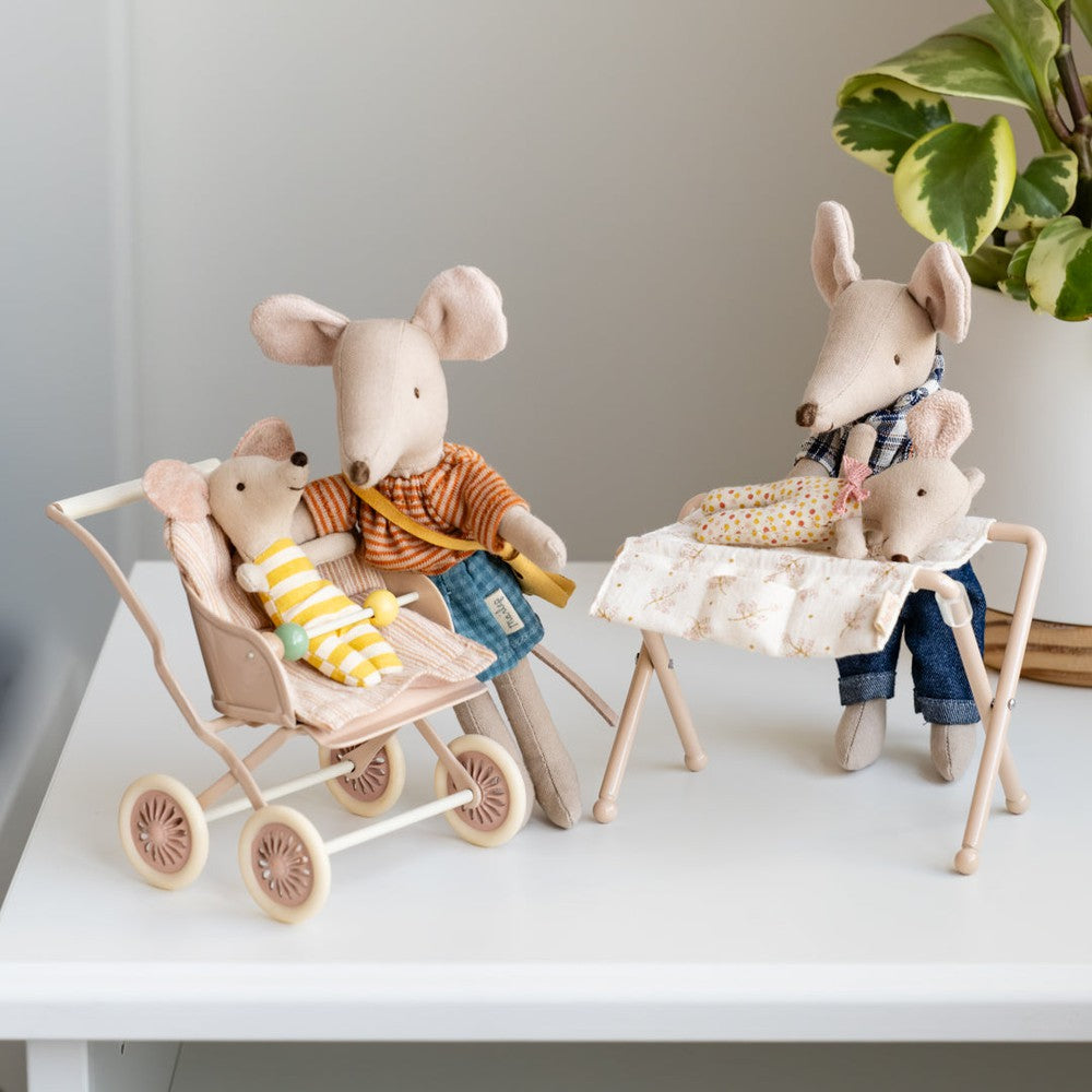 A changing table fit for a baby mouse! This folding table has a pretty printed cotton cover with handy pockets to store accessories, including a small rattle and a tube of baby lotion.