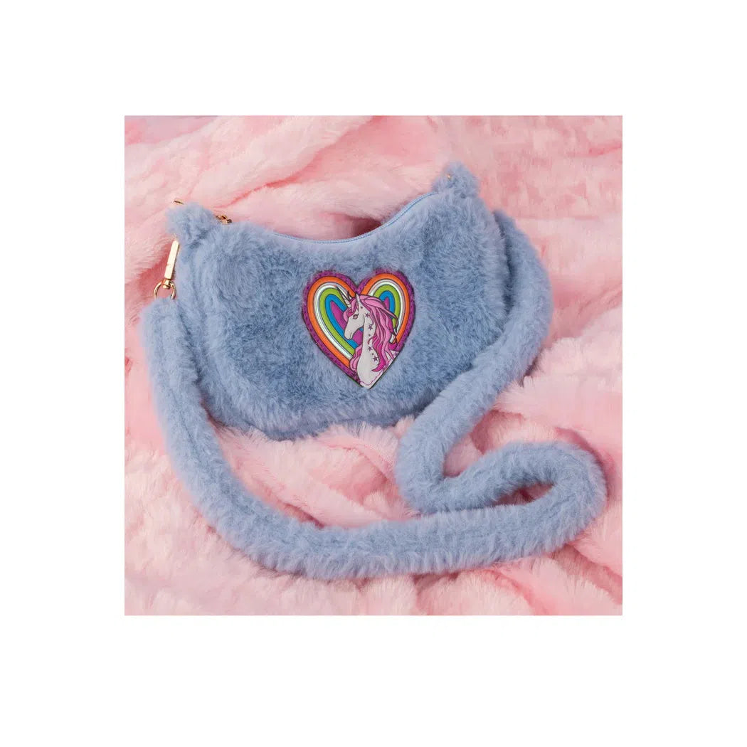 Carry a touch of magic everywhere you go with the Periwinkle Rainbow Cuddle Crossbody Purse! This irresistibly furry purse features a delightful pink unicorn at its heart, framed by a striped rainbow heart in shades of pink, white, green, blue, and purple.