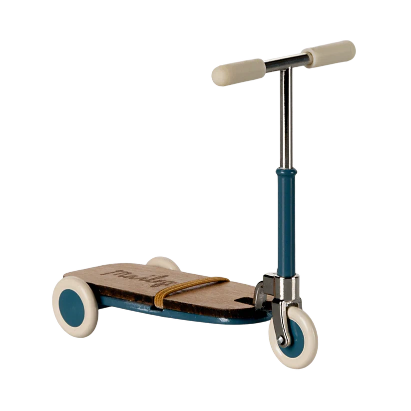 A kickboard with wooden details. The kickboard has a metal stick in the handlebars that makes sure mice with magnets in hands can stay on the board. A small elastic is added on the board and will secure the feet on the board during the ride.