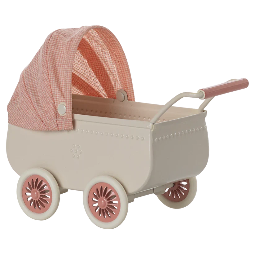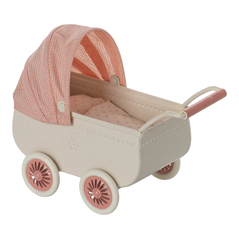 The beautiful pram has a vintage look and comes with a small mouse in a sleeping bag. The mouse is laying on a soft mattress in the pram and will sleep for hours.
