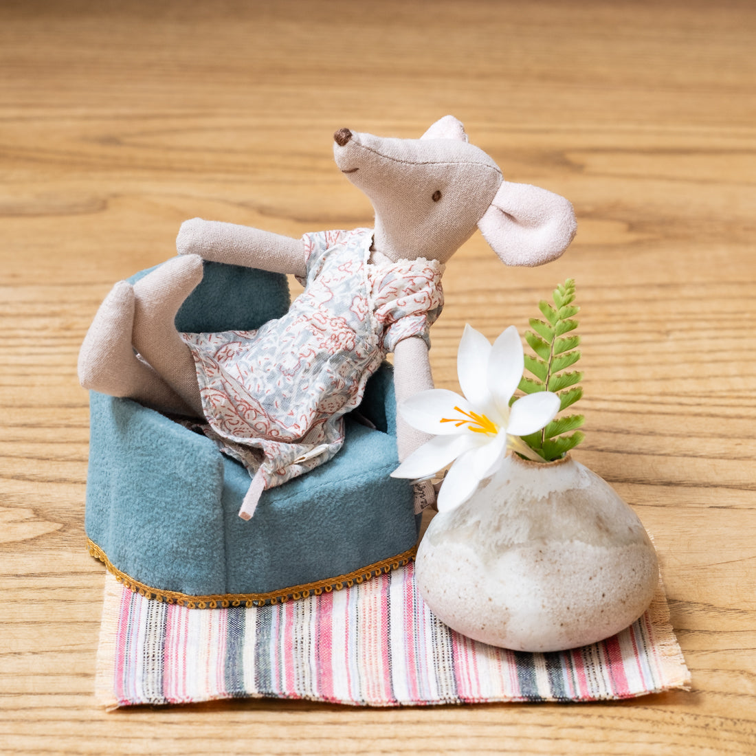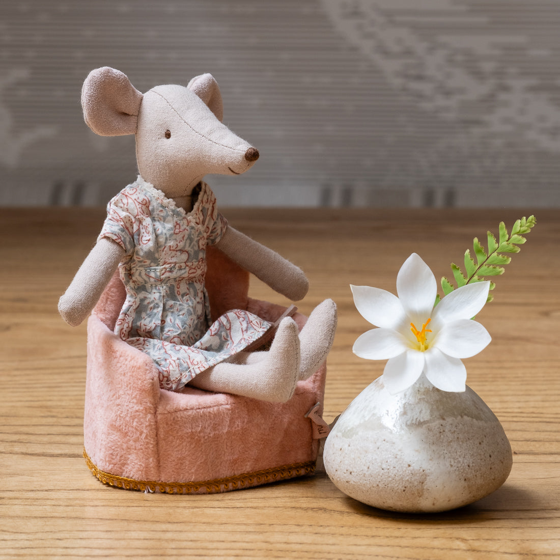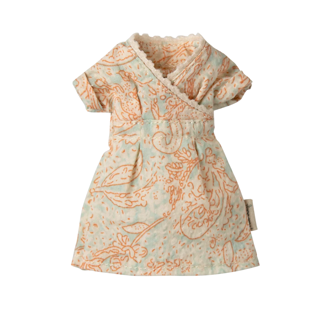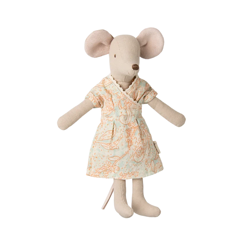 A classic Maileg item; Mum mouse in a light dress. This mouse fits furniture and accessories in size mouse. Buy more clothes separately. Clothes in size mum/dad fits this mouse.