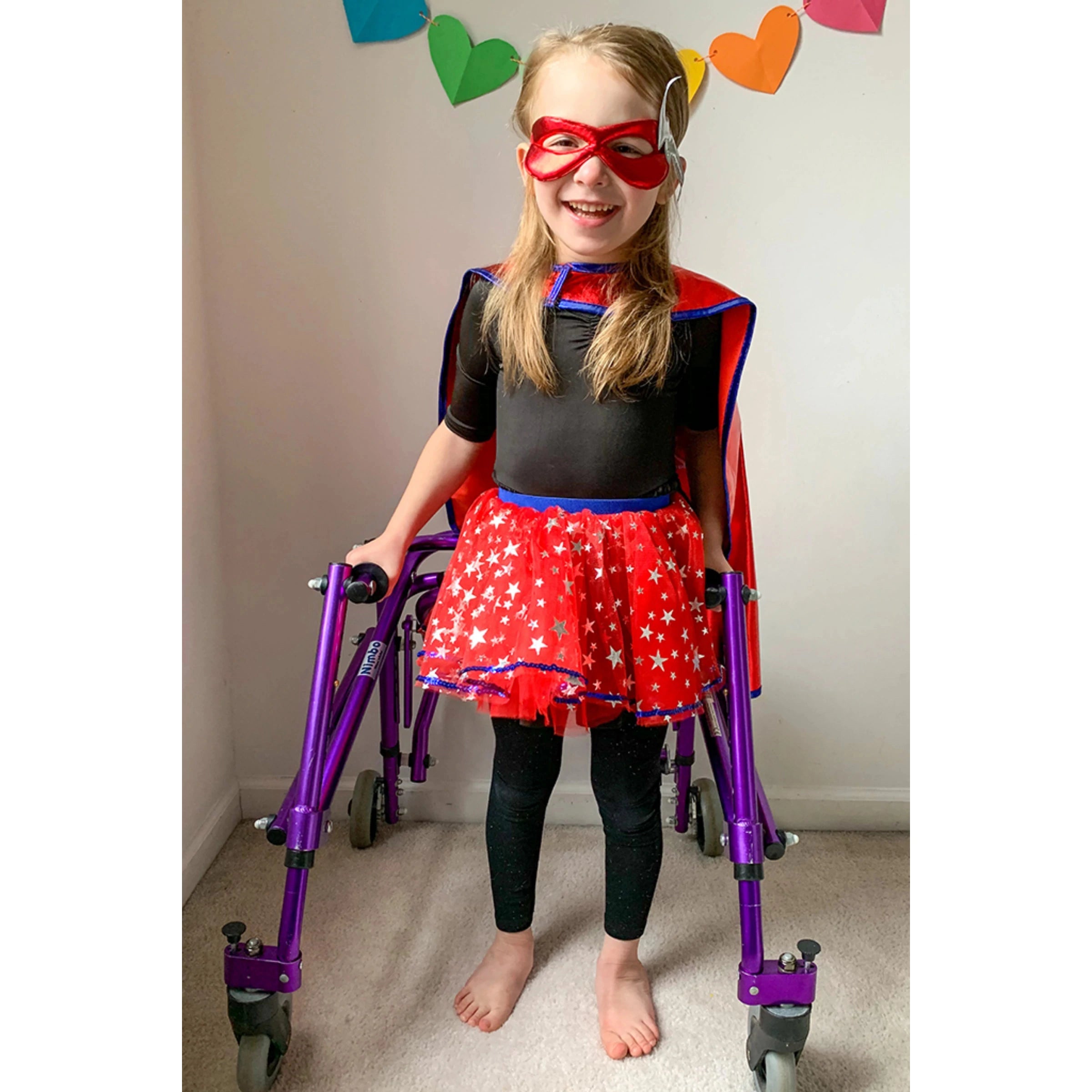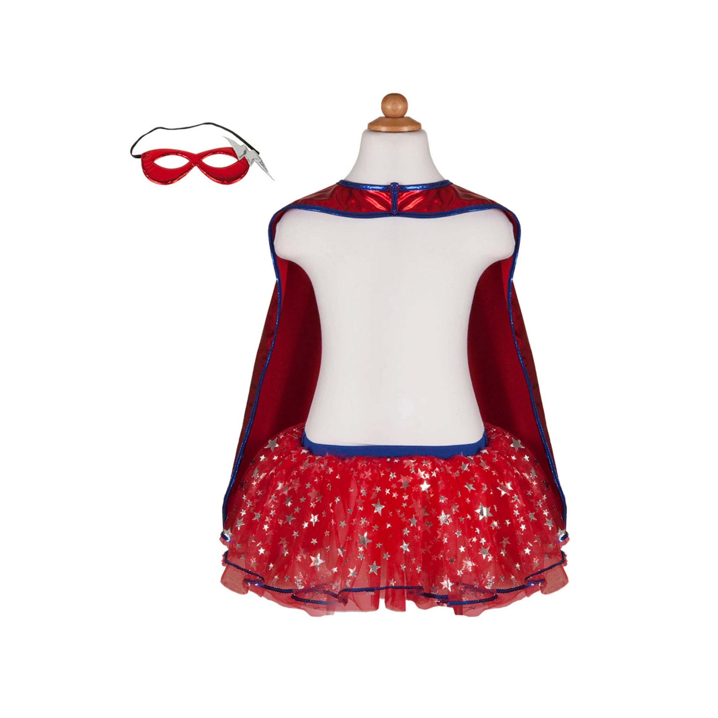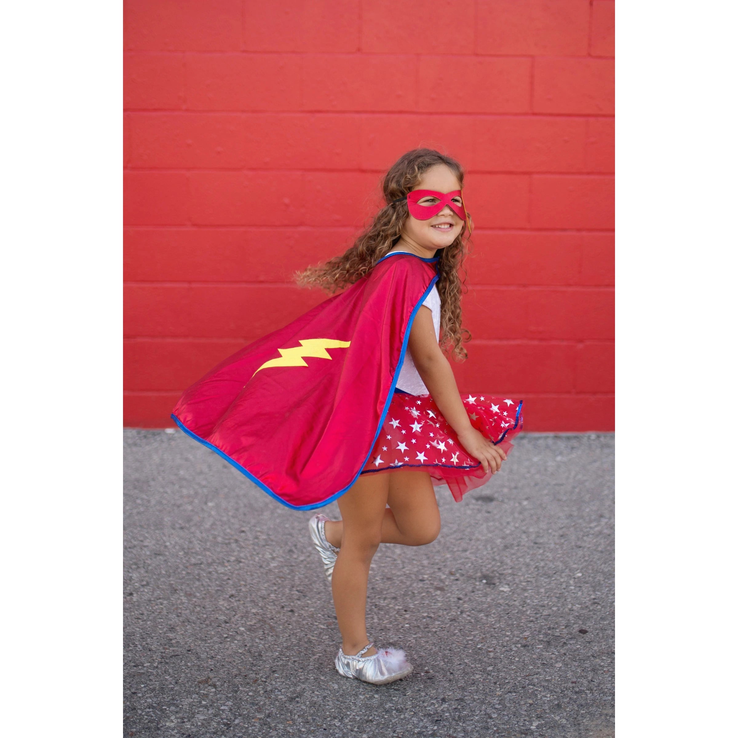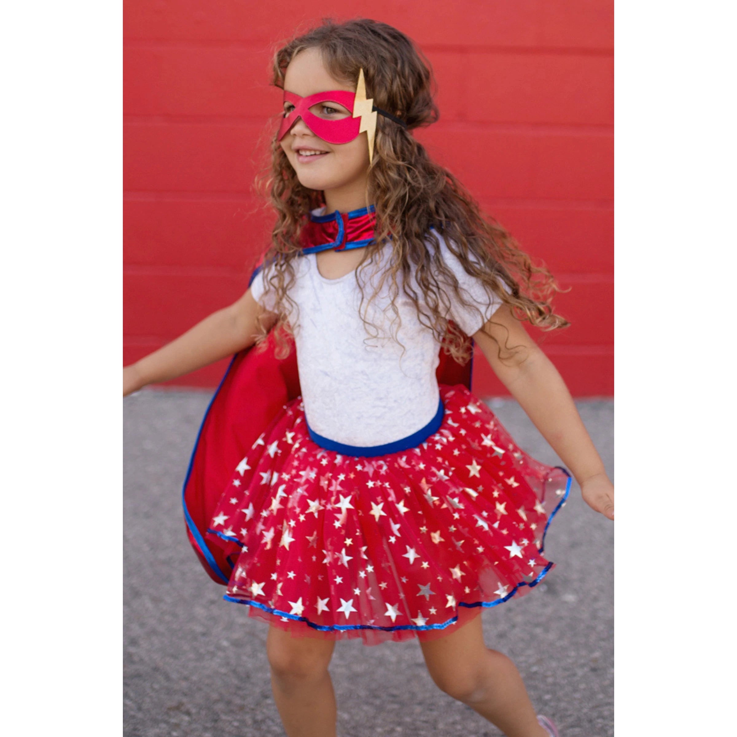 Save the day and be your own superhero with this amazing cape-tutu set with a matching mask. The lighting bright red tutu featuring a silver star pattern and is trimmed in blue sequins. The matching cape is bound in blue shine and features a matching lighting bolt to the soft, easy-on-and-off, superhero mask.