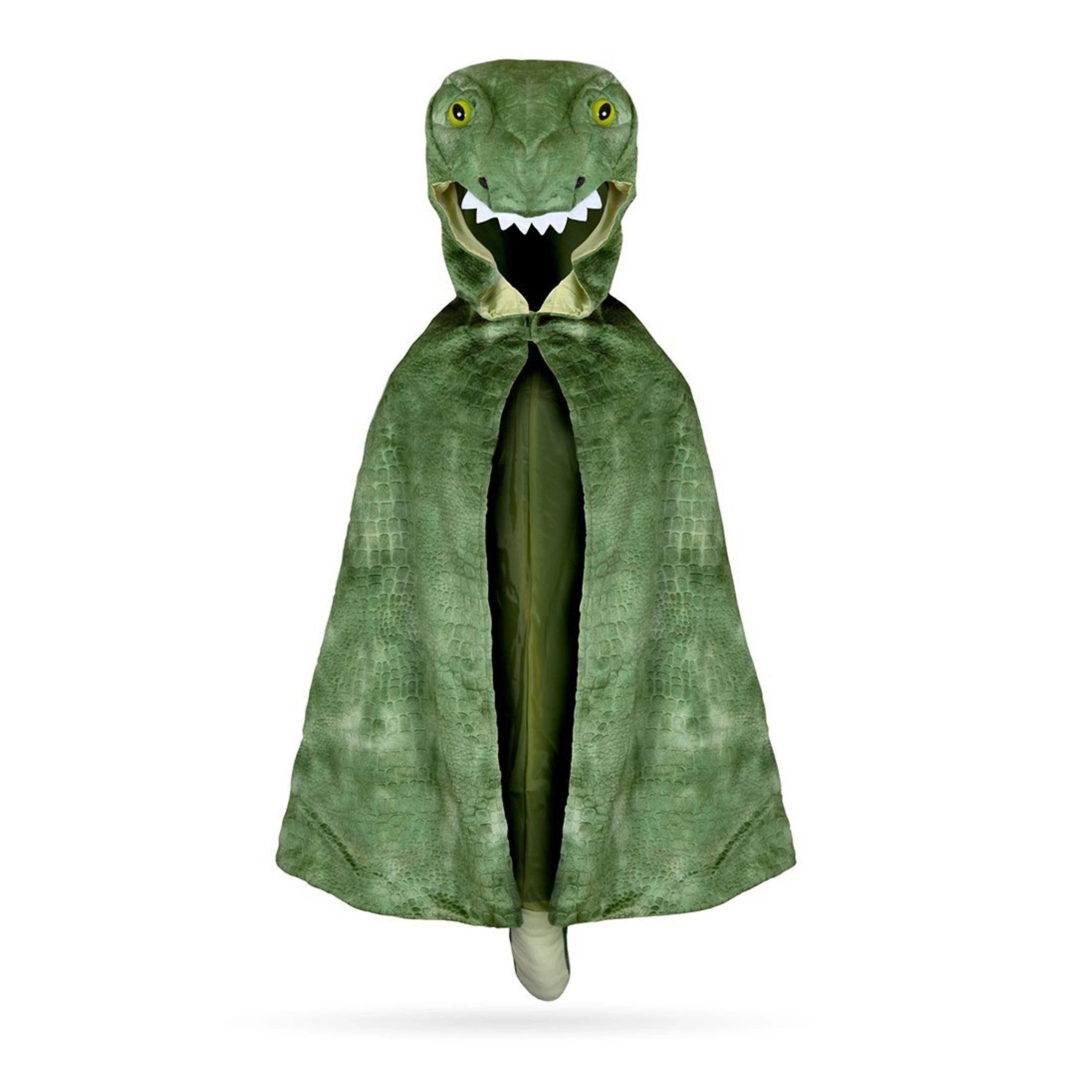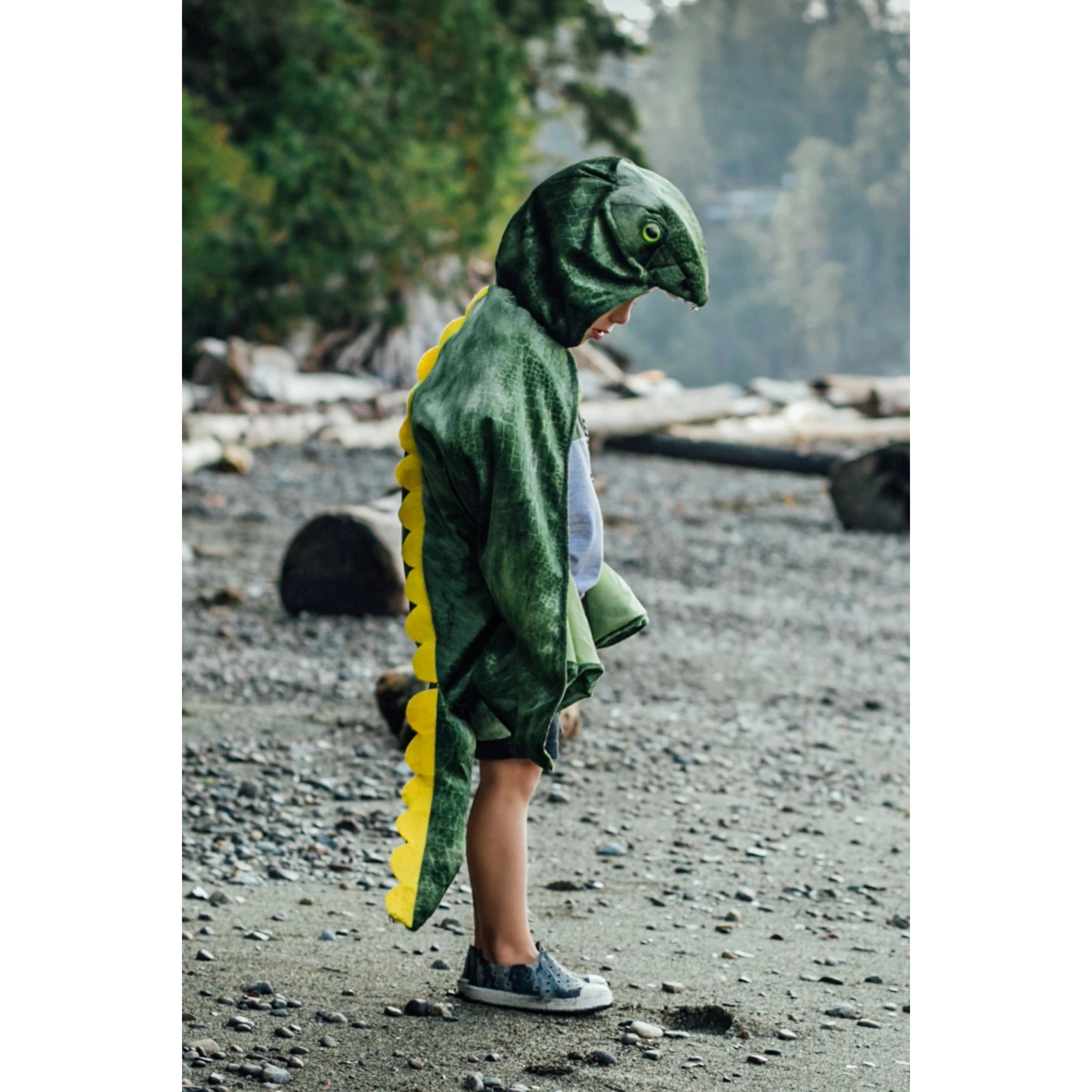 Dinosaurs that are Jurassic! This Dino Cape from our Dino Collection, features textured velour, realistic eyes, and 3D stuffed detailing on the hood. The T-Rex is the king of dinosaurs and has a long trailing tail and big felt teeth! A lined hood and Velcro closure makes this cape durable and always machine washable.