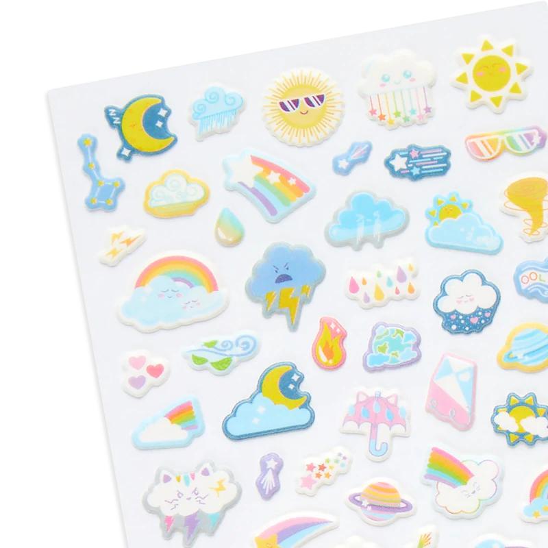 The forecast is calling for some fun with these endearing weather and sky-themed stickers. This set is a part of Itsy Bitsy’s line of super cute stickers and comes on one jam–packed sheet. Each puffy sticker features a weather-themed design, like colorful rainbows, a serene crescent moon, or a puffy rain cloud.
