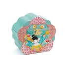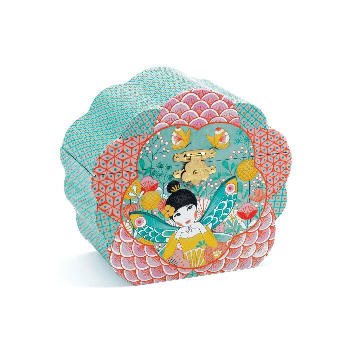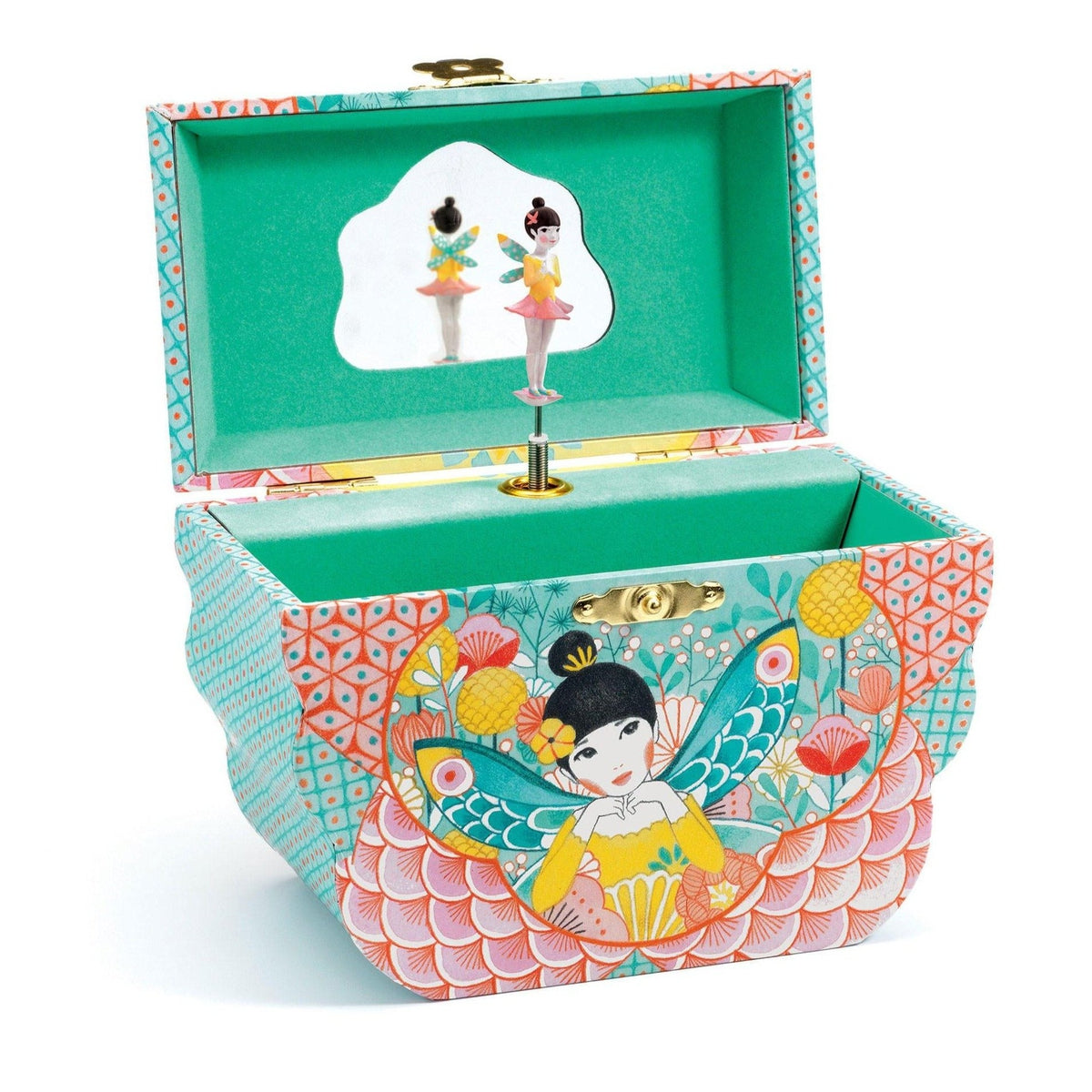Keep all your precious jewels, gems, and mementos safe in this musical treasure box from Djeco. This paper covered box has a beautiful flower shape with scalloped pattern and fairy illustration and figurine. Turn the crank, open the box, and watch as the small fairy figure comes to life to the music. This box also has a mirror, felt lining, and a metal clasp closure.