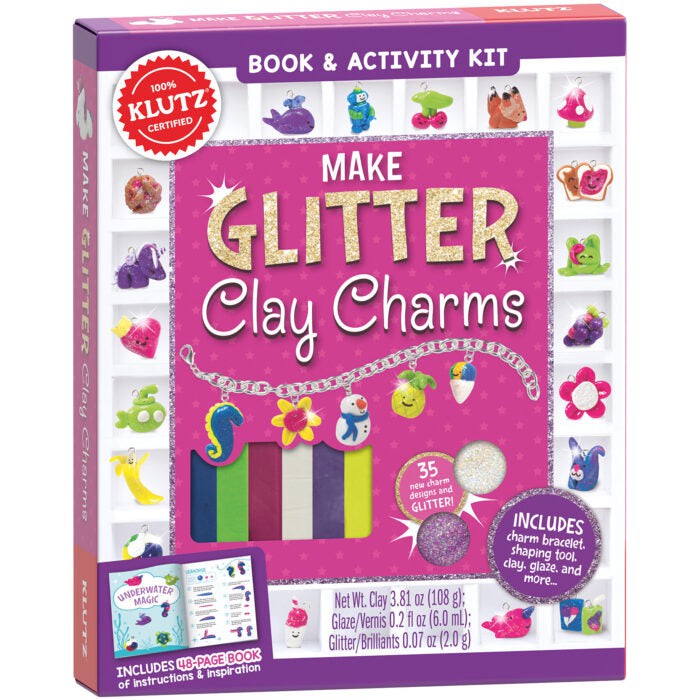 - includes 2 colours sparkly glitter, 6 bright colours of clay, klutz specially formulated glaze, jump rings and charm loops, charm bracelet, klutz custom clay shaping tool, drying and display rack.