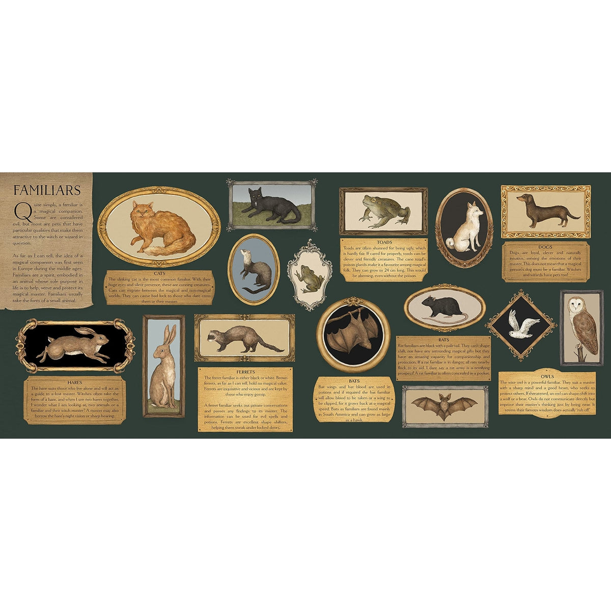- Familiars (Choose the perfect magical companion. If you love to gossip, you might choose a ferret as your familiar or, for improved thinking, an owl.)