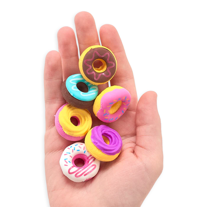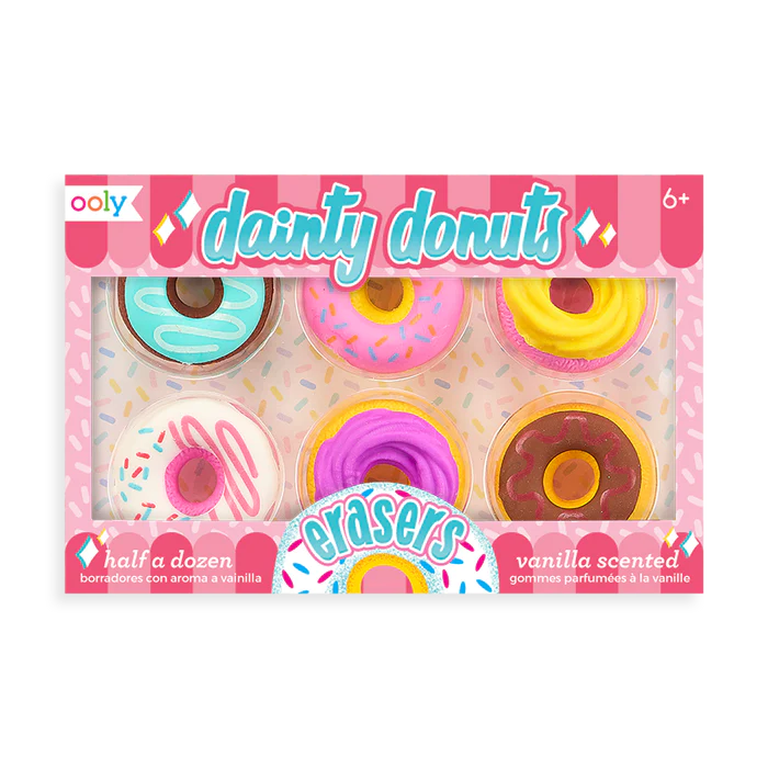 Erase in style with Dainty Donuts Pencil Erasers. This cute eraser set comes with half a dozen donut erasers that will make your pencil made mistakes disappear in a sweet looking way. Dainty Donuts are scented erasers too; they smell like sweet vanilla. This pencil eraser set is sure to make your day at school, home or work way sweeter too. Suitable for ages 6 and up.