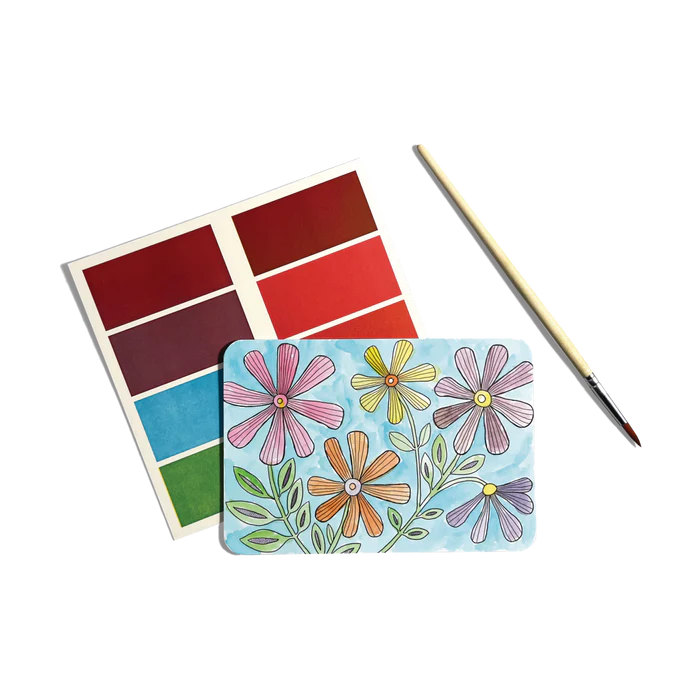 - Kit includes 8 different watercolour postcards, 8 paint palettes, 1 paint brush, and a colour guide