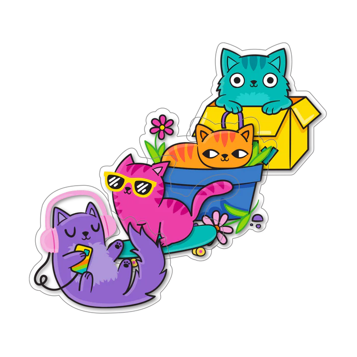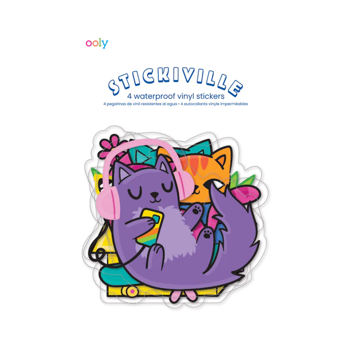 - Stickers feature silly cats in different places: on a skateboard, in a box, in a plant, and listening to music