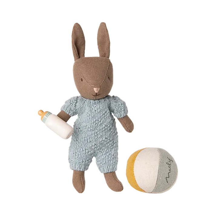 The perfect gift set to start hours of storytelling. It contains a small ball, a soft rabbit in size micro with magnets in hands to hold the babybottle. All fitted nicely together and a great start of any rabbit collection.