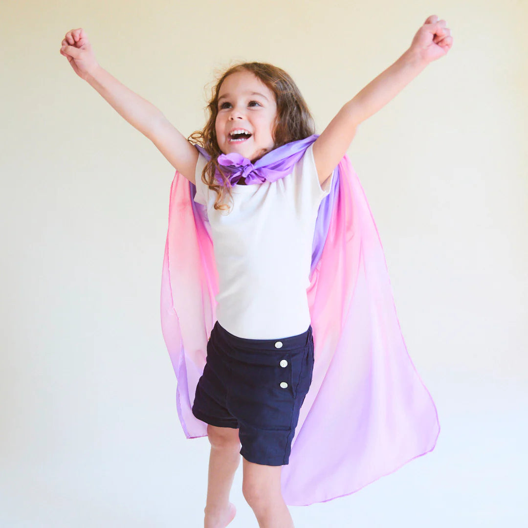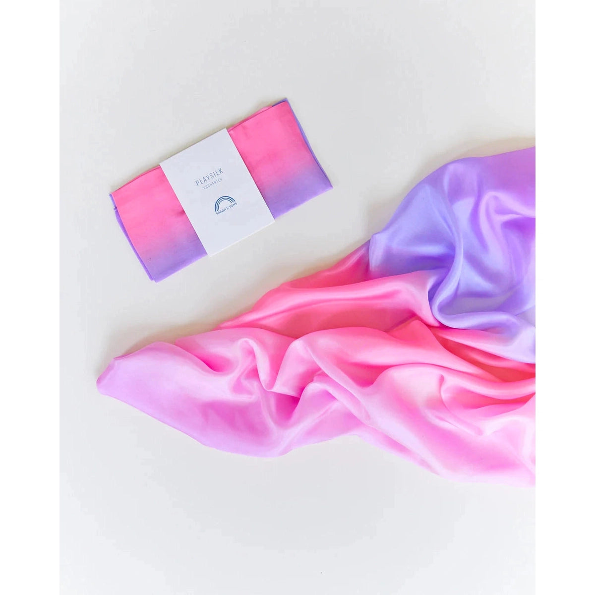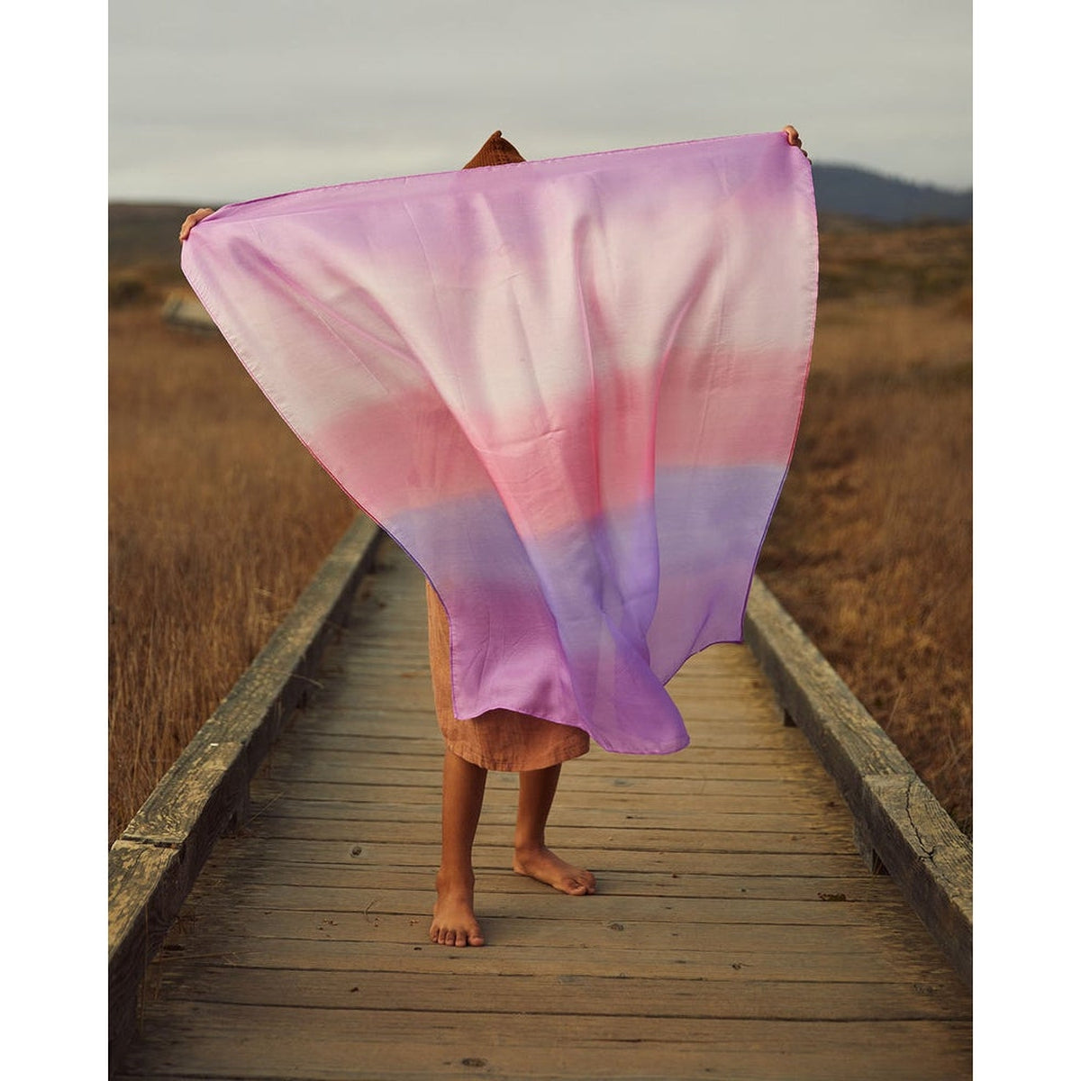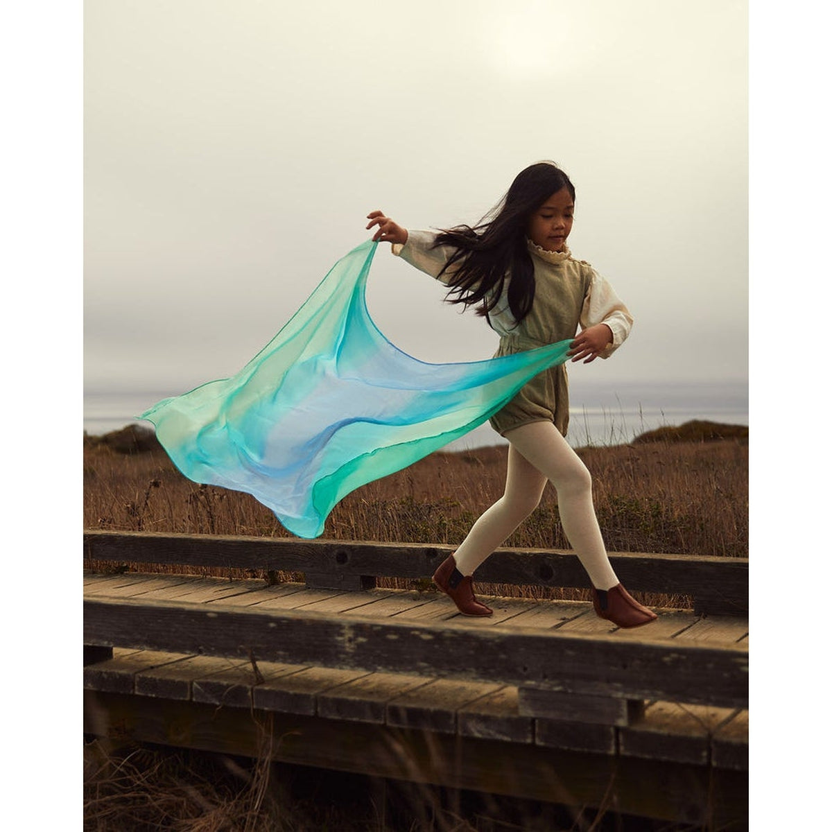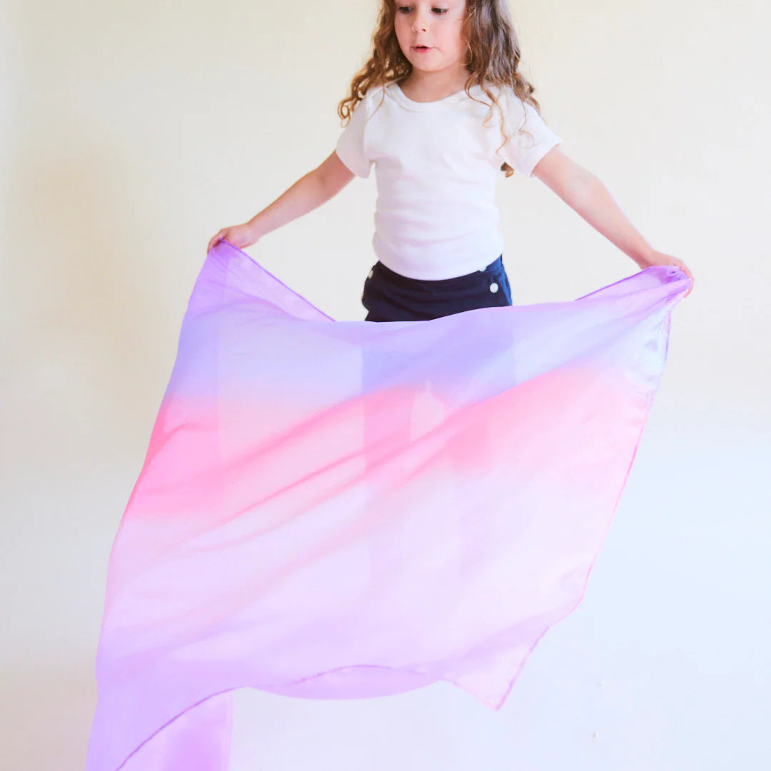 Sarah's Silks playsilks are 35" squares that are dyed with non-toxic, eco-friendly dyes. One of the most versatile toys, one moment playsilks are a canopy to sit under, the next they are boiling lava to jump over. One can be grass to feed your horse, and another might be a doll carrier, a cape, or soup in a pot! The play options with playsilks are as limitless as your imagination. The Enchanted Playsilks are made with beautiful blended colours, such as "blossom" in pink tones and "sea" in blue tones.