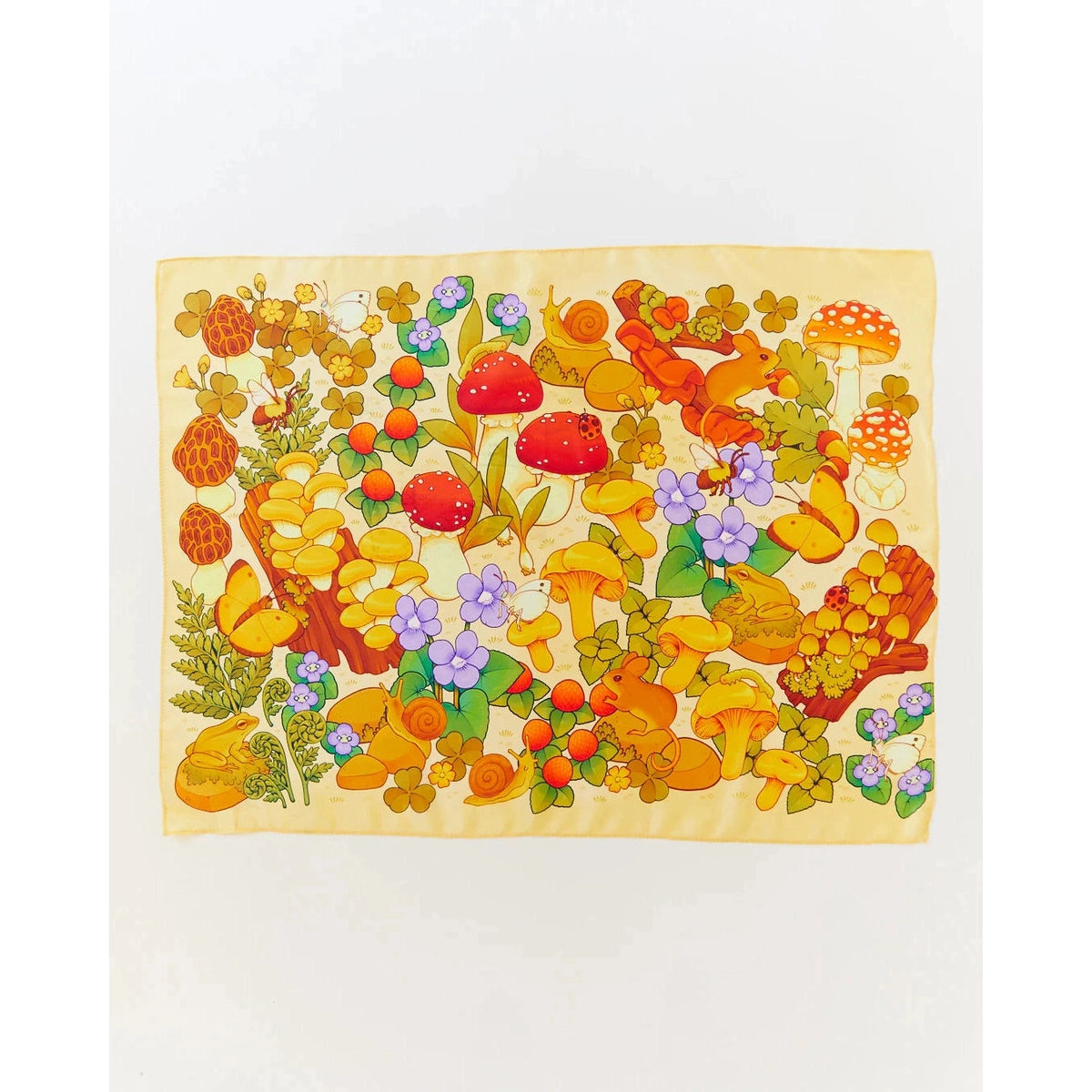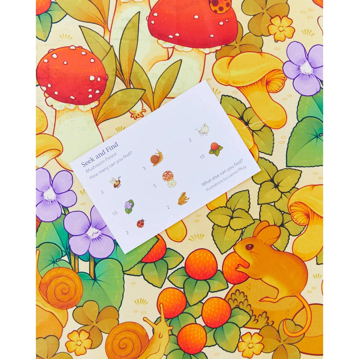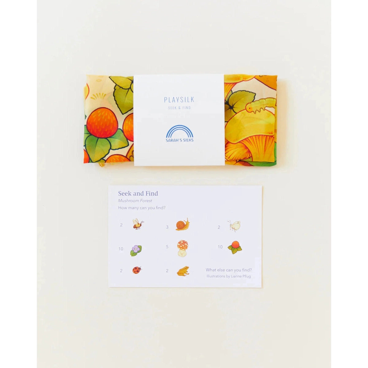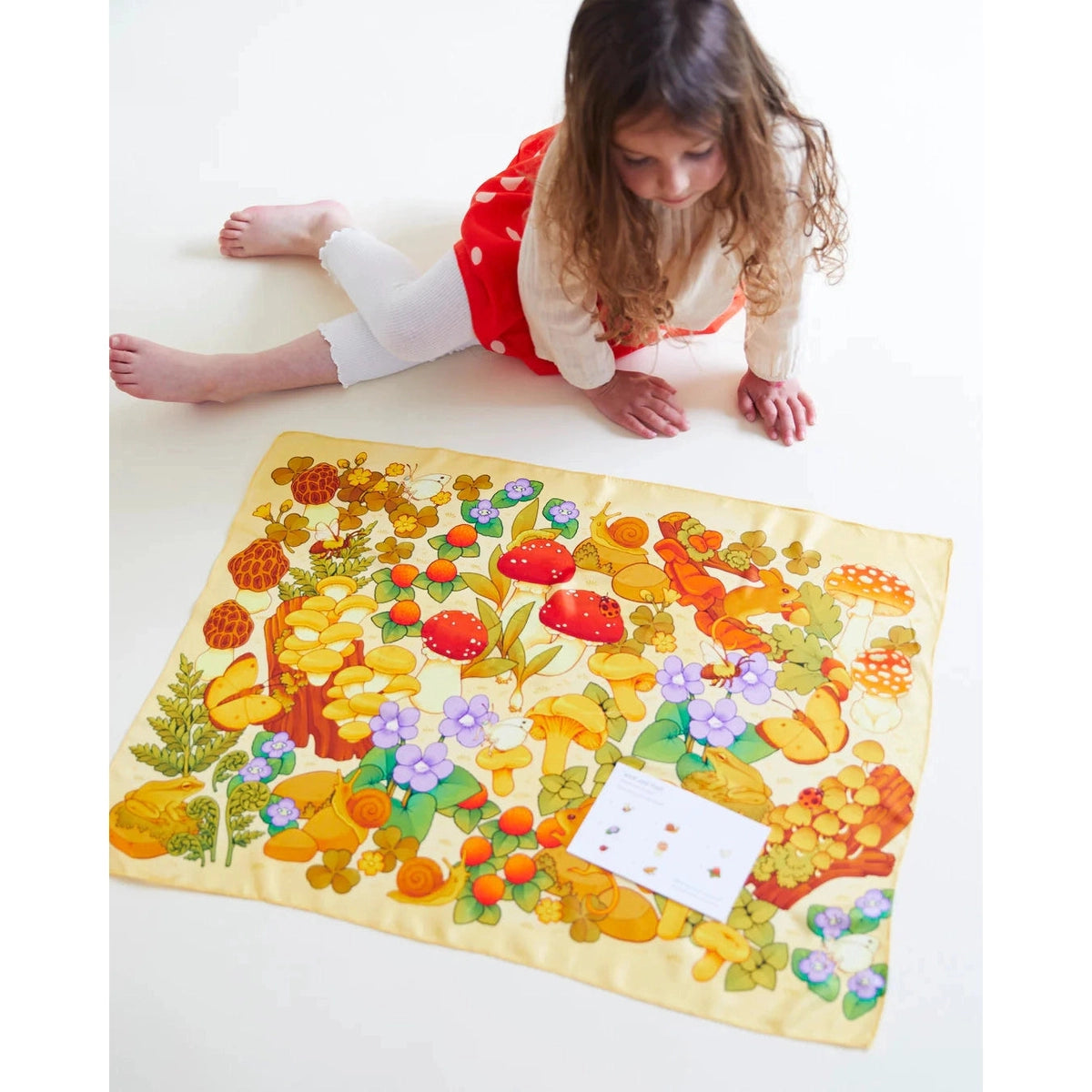 Seek & Find Playsilks are made in collaboration with different artists. The Mushroom Seek & Find features artwork by Lianne Pflug, you can find her on Instagram @loonpflug