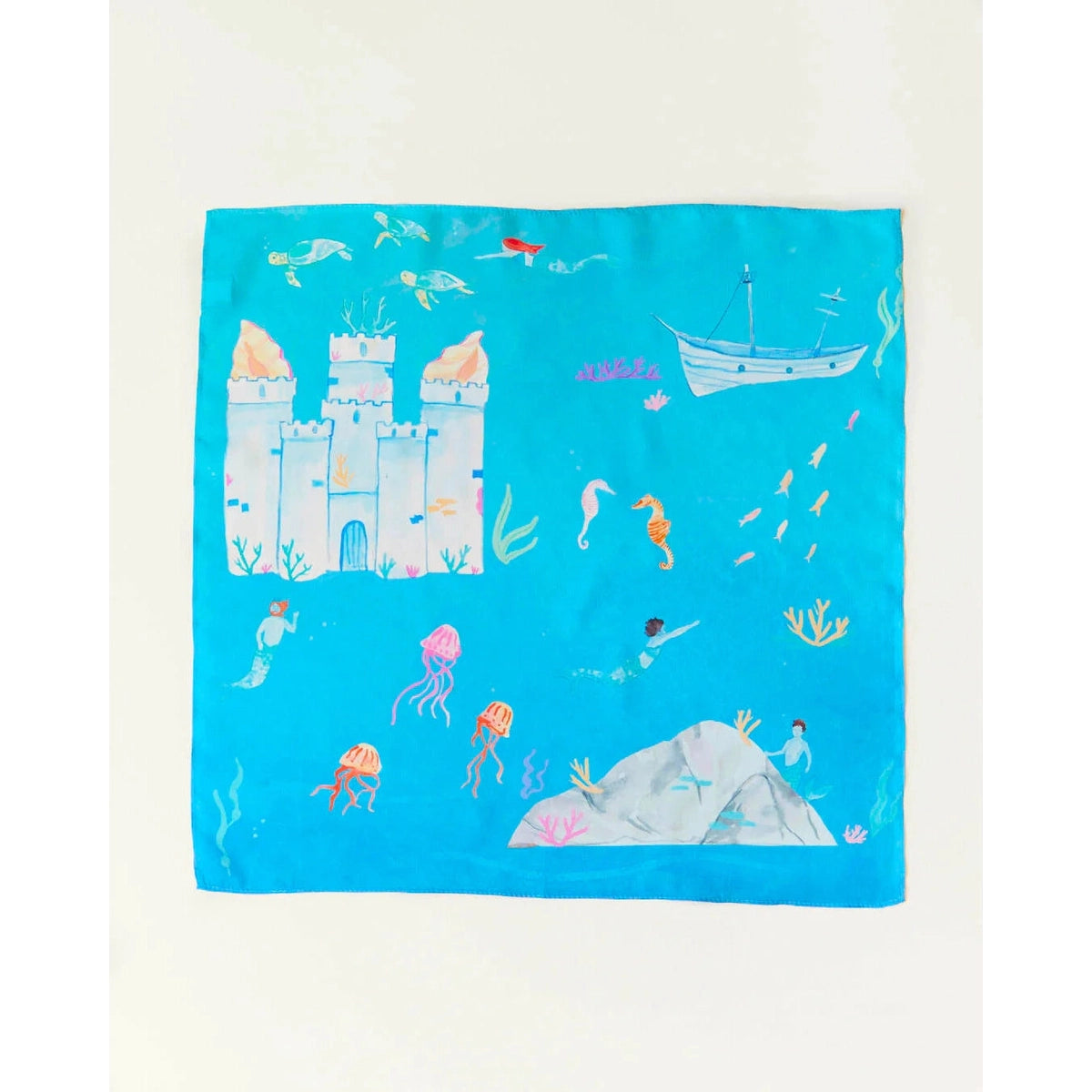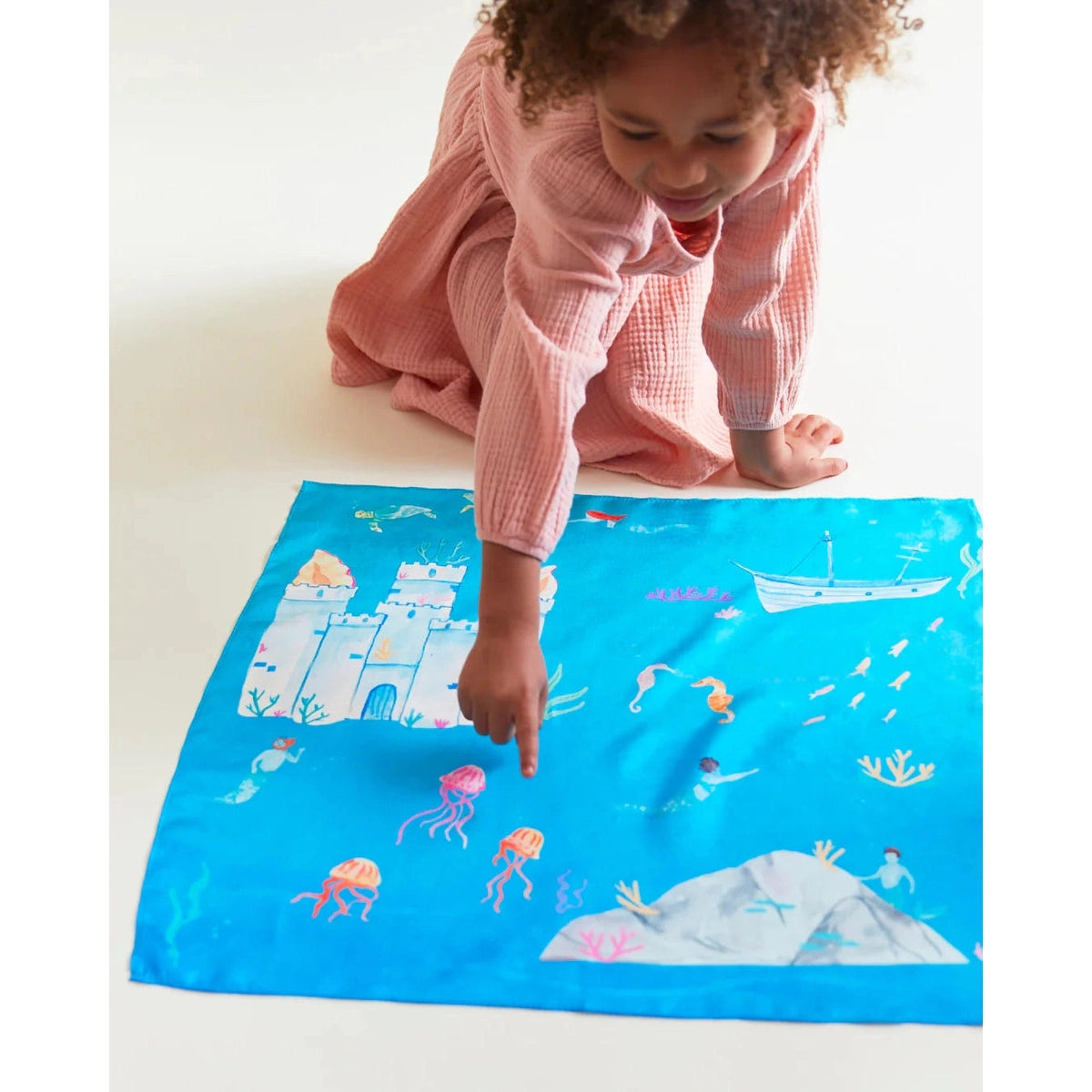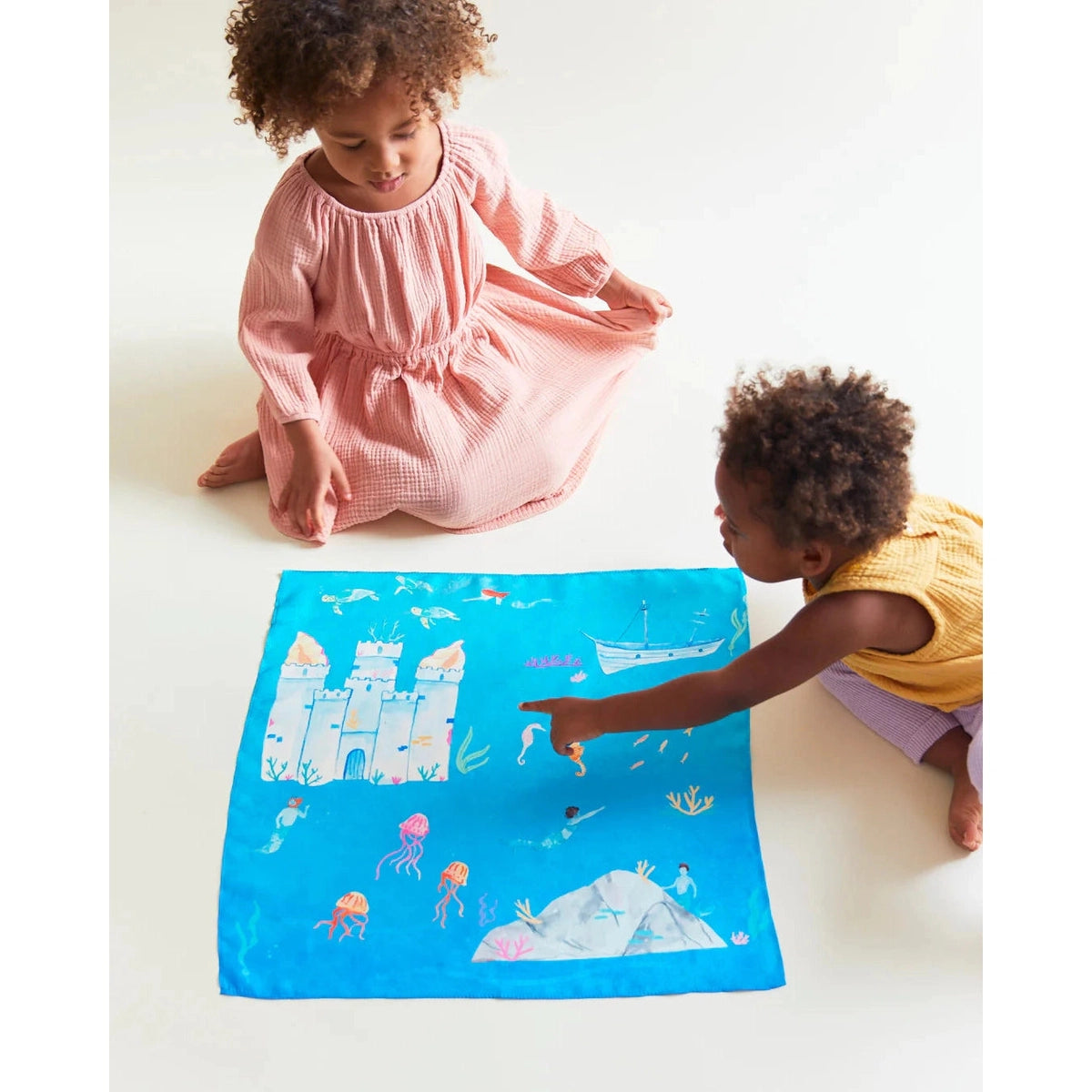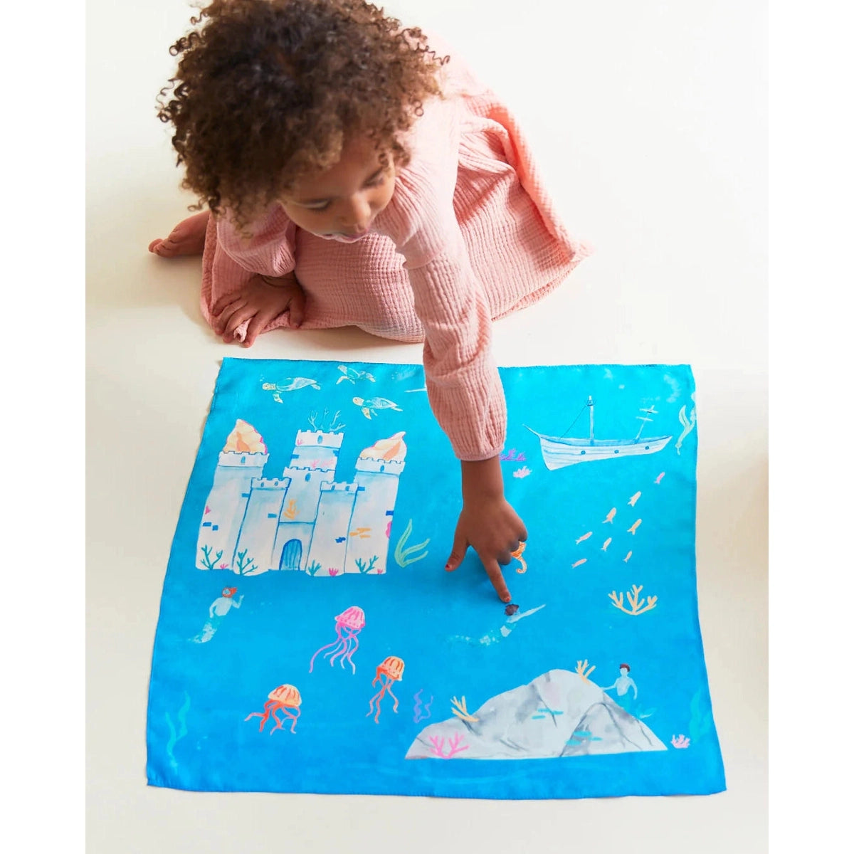 Featuring a limited edition Mini Playsilk, depicting a fantastical under water scene featuring merfolk and sea creatures - perfect for small world, imaginative play.