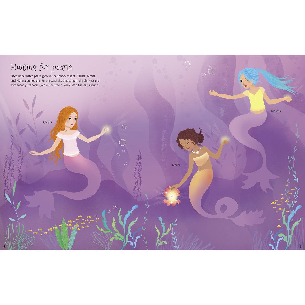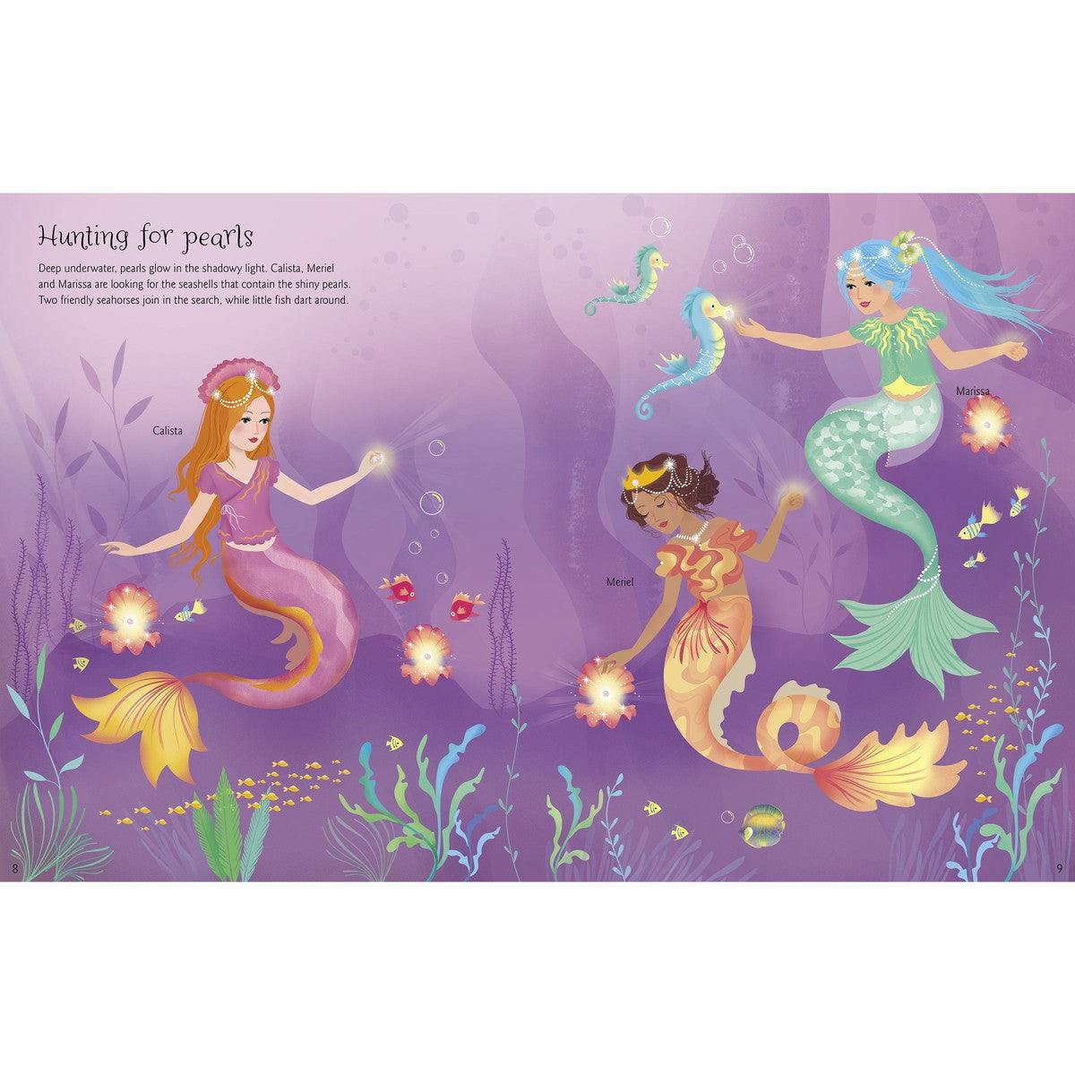 Dive into an undersea world where mermaids gather pearls, meet a mermaid queen, find a treasure chest and dive with seals. With hundreds of stickers to dress the mermaids and add sea creatures and treasure to the scenes, including some extra special sparkly stickers.
