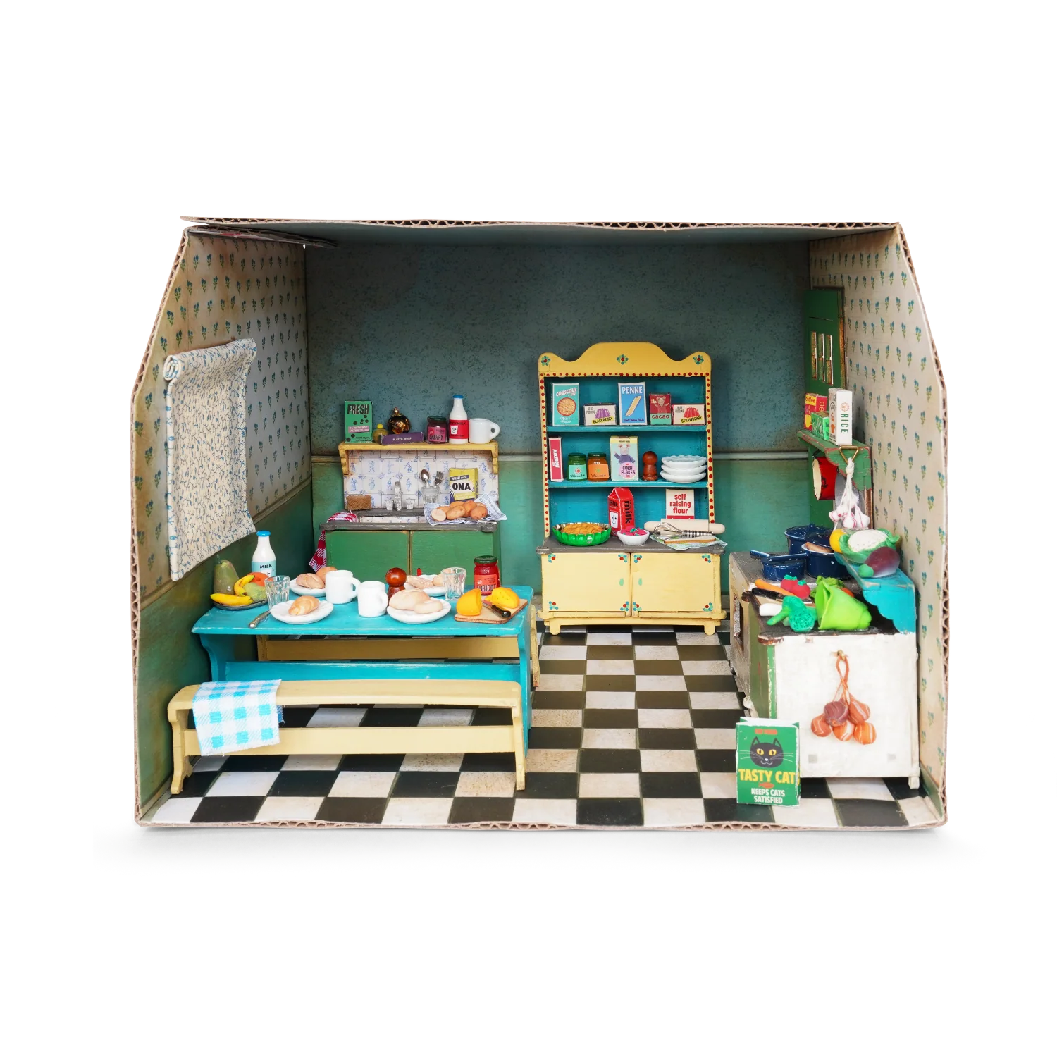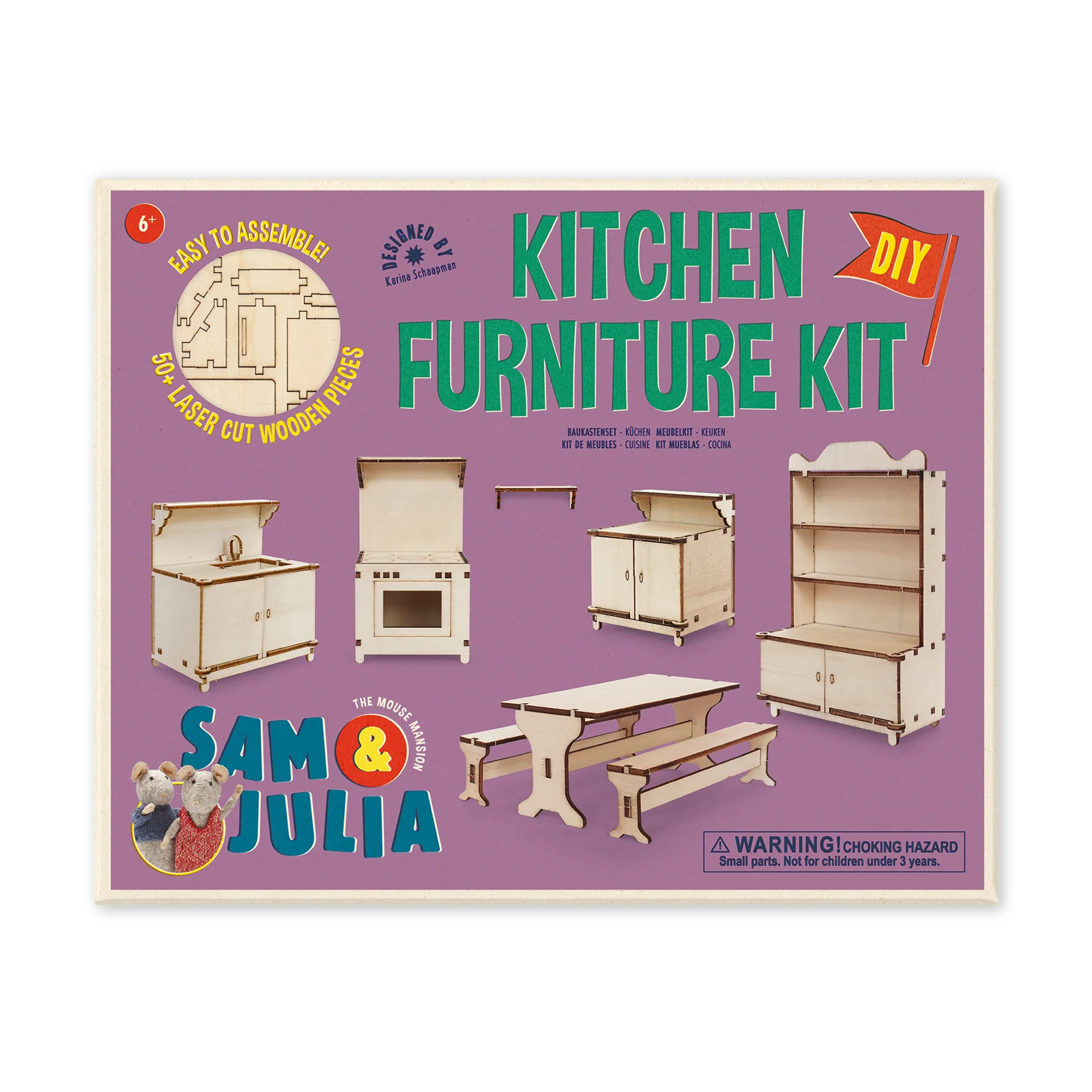 Create a mini kitchen with this furniture kit! The pre-cut wooden pieces can be easily assembled with simple instructions and are 1:12 scale. Based on the Mouse Mansion book series by Karina Schaapman, the kit lets you bring the charming world of Sam and Julia to life. This furniture kit includes a miniature stove, a sink, a dining table, a kitchen cupboard, and two dining benches. Paint, glue, and accessories are sold separately.