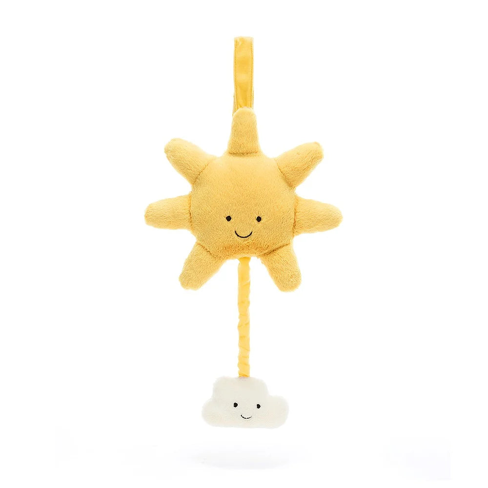 Introducing Amuseables Sun Musical Pull, a ray of sunshine to brighten any nursery! Gently pull on the cheery cream cloud and an original Jellycat lullaby will play from the cheerfully soft sun. Fasten onto a crib or pram with the Velcro attachment and whatever the weather, there will be joyful sunshine for Baby.