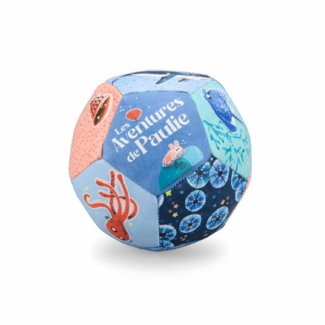 Baby's first ball, this soft toy from Moulin Roty is lovingly decorated in the style of Adventures of Paulie, with bright blues and playful ocean animals. Small and soft, this ball is great to be rolled around and tossed back and forth with your little one.