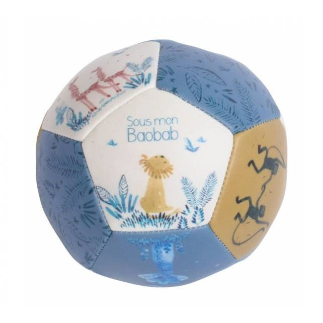Baby's first ball, this soft toy from Moulin Roty is lovingly decorated with adorable animals, with muted colours of blues and golds. Small and soft, this ball is great to be rolled around and tossed back and forth with your little one.
