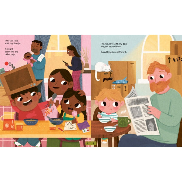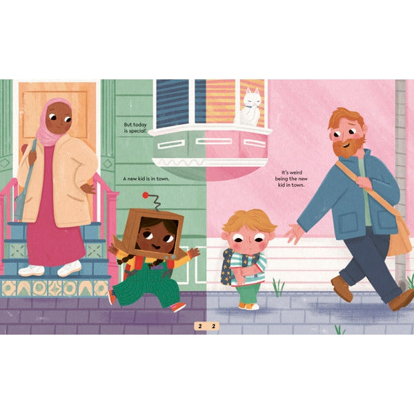 One book follows Joe on his first day at school, and the other shows Mae on her quest to make friends with the new kid. The stories can also be read side-by-side, as spreads from each book complement each other and are linked with corresponding page numbers. The final spread at the back of the book reveals a shared ending, in which Joe and Mae are united in the playground!