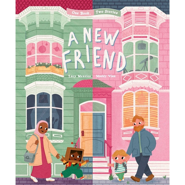 A New Friend is the next book in the One Book, Two Stories format. With this innovative format, two books, telling two different stories, are bound together.