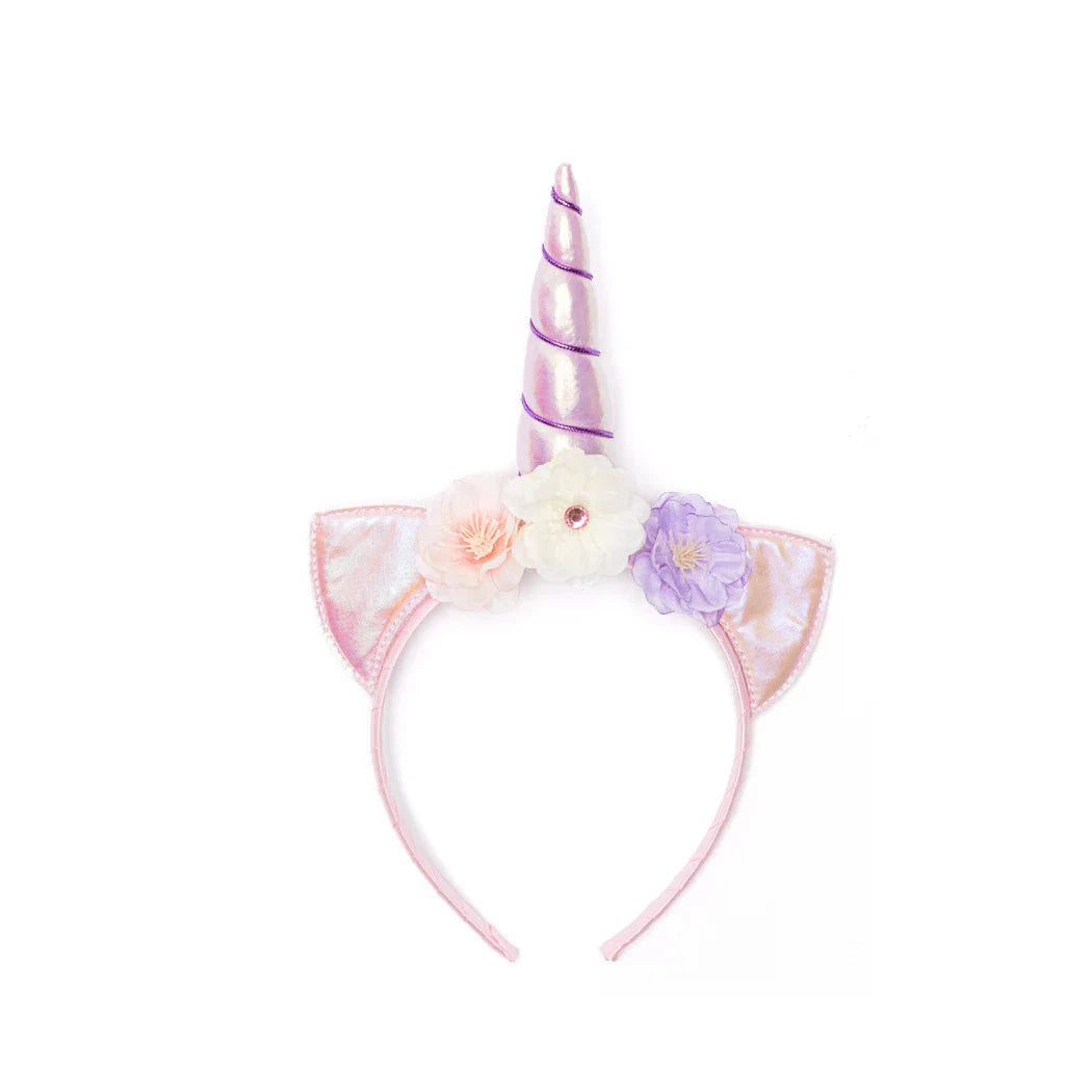This headband is made with pink iridescent spandex, a lilac horn with three delicate faux flowers spanning the front of the headband.