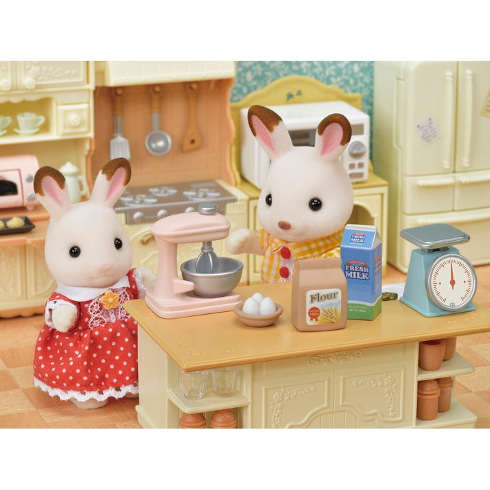 This kitchen island play set is packed with accessories for all sorts of baking and cooking tasks. Island includes a sink, mixer set, donut maker with exchangeable waffle moulds, and baking ingredients. Pair with your favourite Calico Critters and the Kitchen Play Set or use on its own to bake up an imaginary miniature storm! When you are done, store everything away in the cabinets and shelves below.